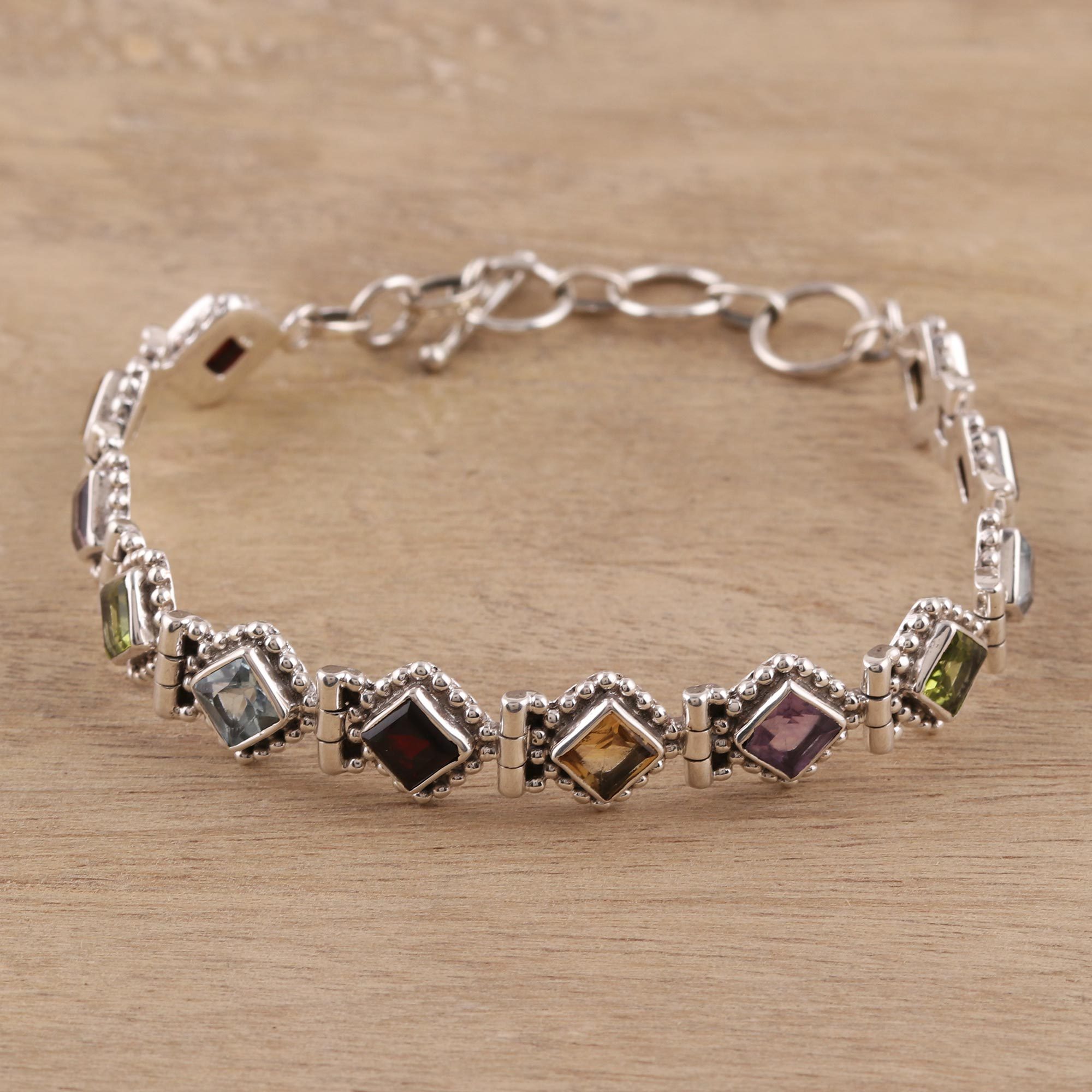 Neeru Goel of India brings together five dreamy rainbow gemstones in this exquisite tennis bracelet. Faceted garnet, citrine, amethyst, peridot and blue topaz stones totaling six carats dazzle the centers of diamond-shaped sterling silver bezels. This bracelet fastens with a toggle clasp.