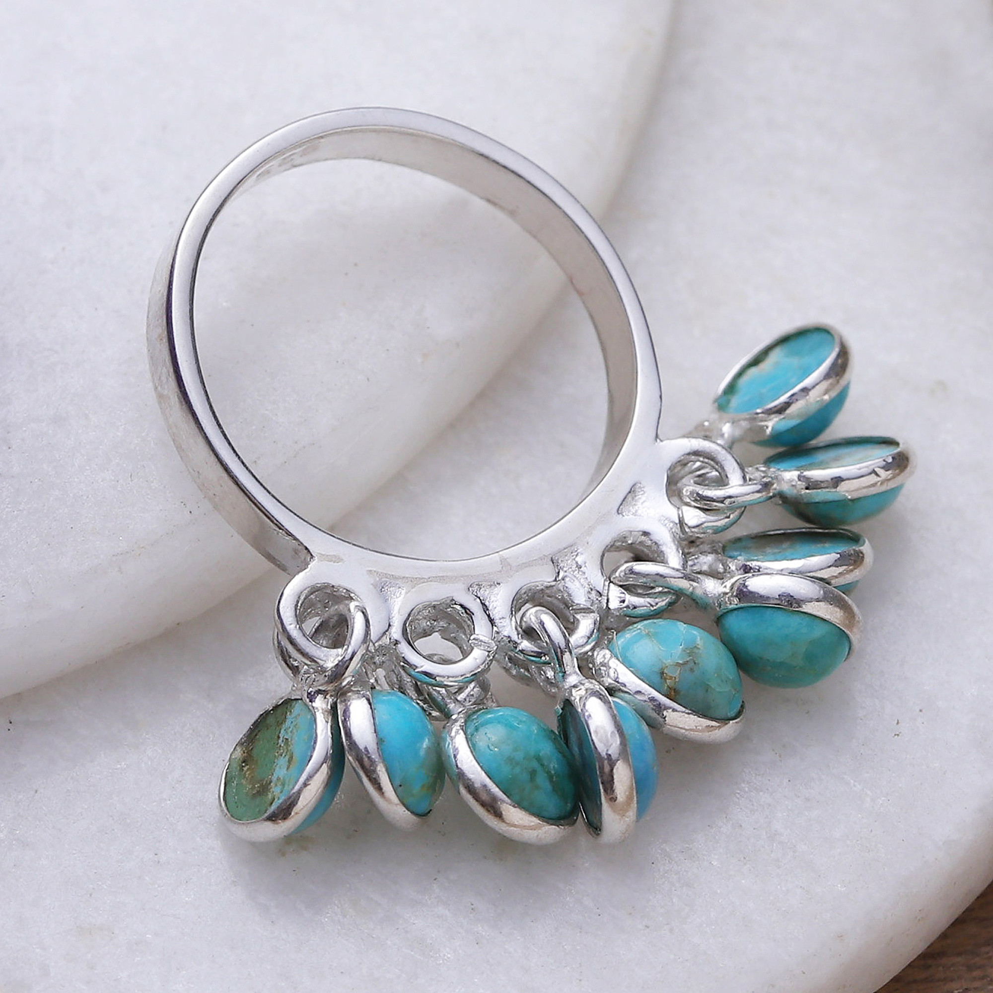 Ten exquisite jewels cluster along a ring presented by Alok Jain of India. Made as a mystic homage to the region's jewelry arts, this sterling silver accessory boasts a captivating illusion of reconstituted turquoise gems, whose hues dance joyously, recreating the waters of a serene lagoon.