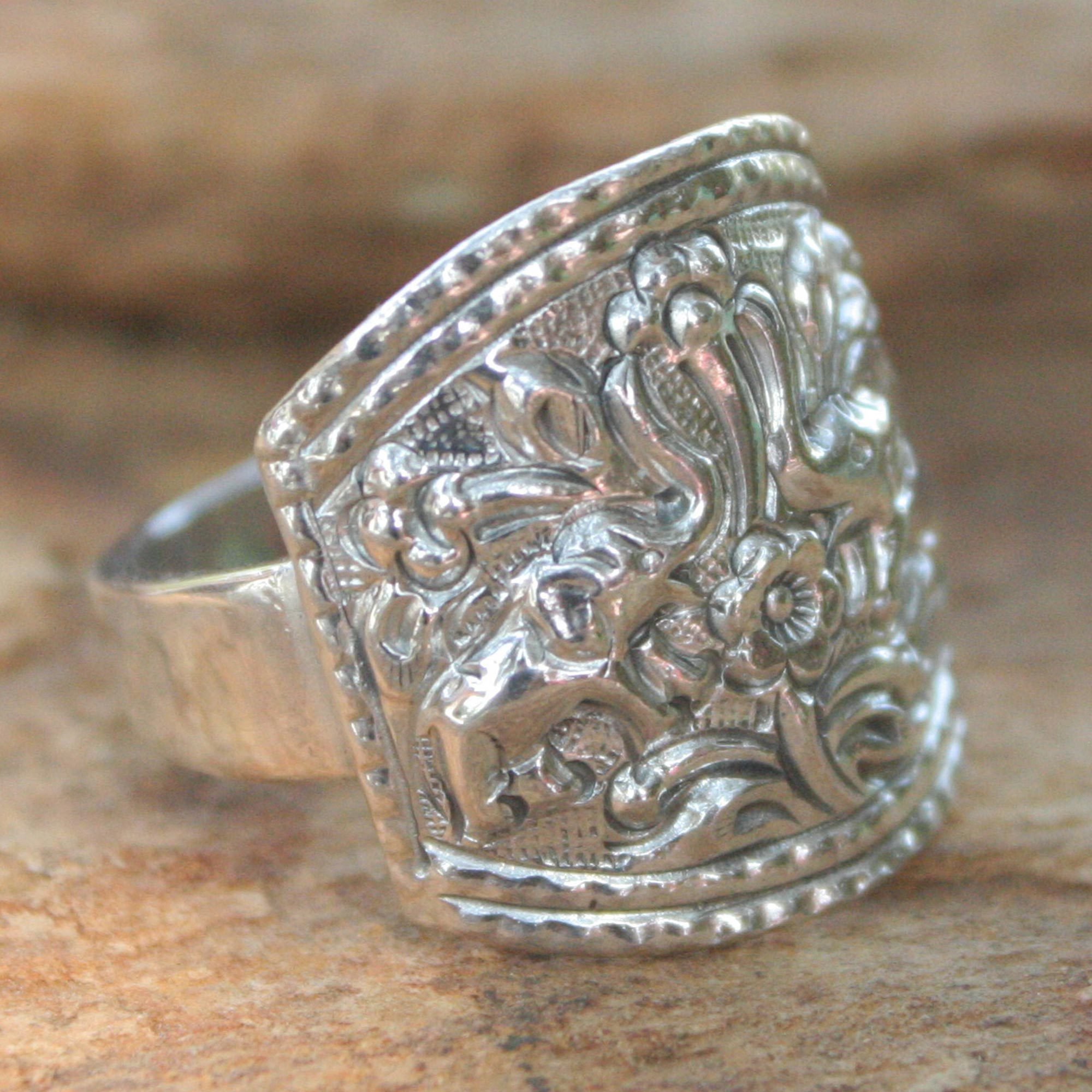 Elephants rejoice with spring's arrival in a ring from Thailand's Achara. It is crafted by hand with sterling silver featuring carefully detailed embossed patterns.