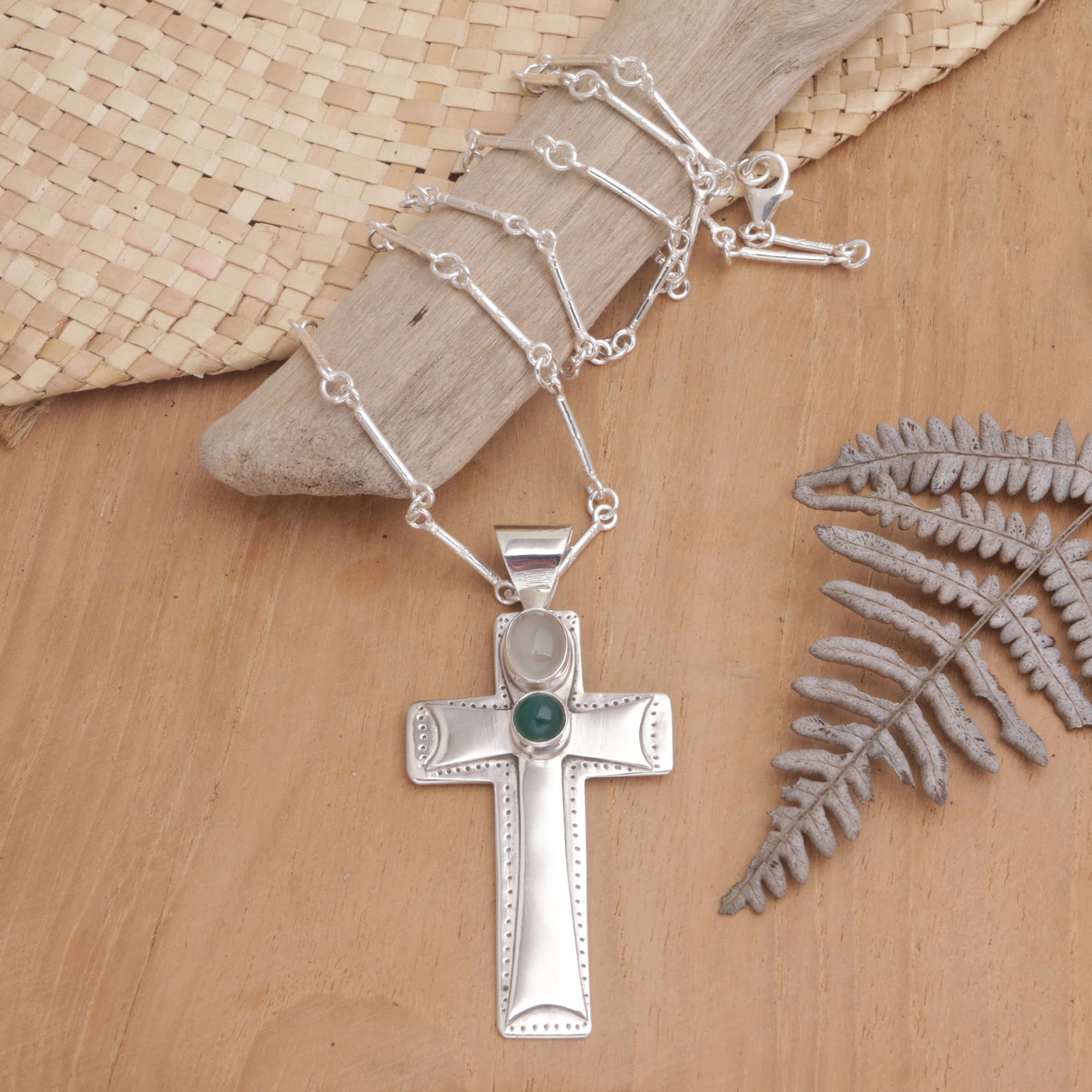 Sterling Silver Cross Pendant Necklace with Agate, 'Heavenly Cross'