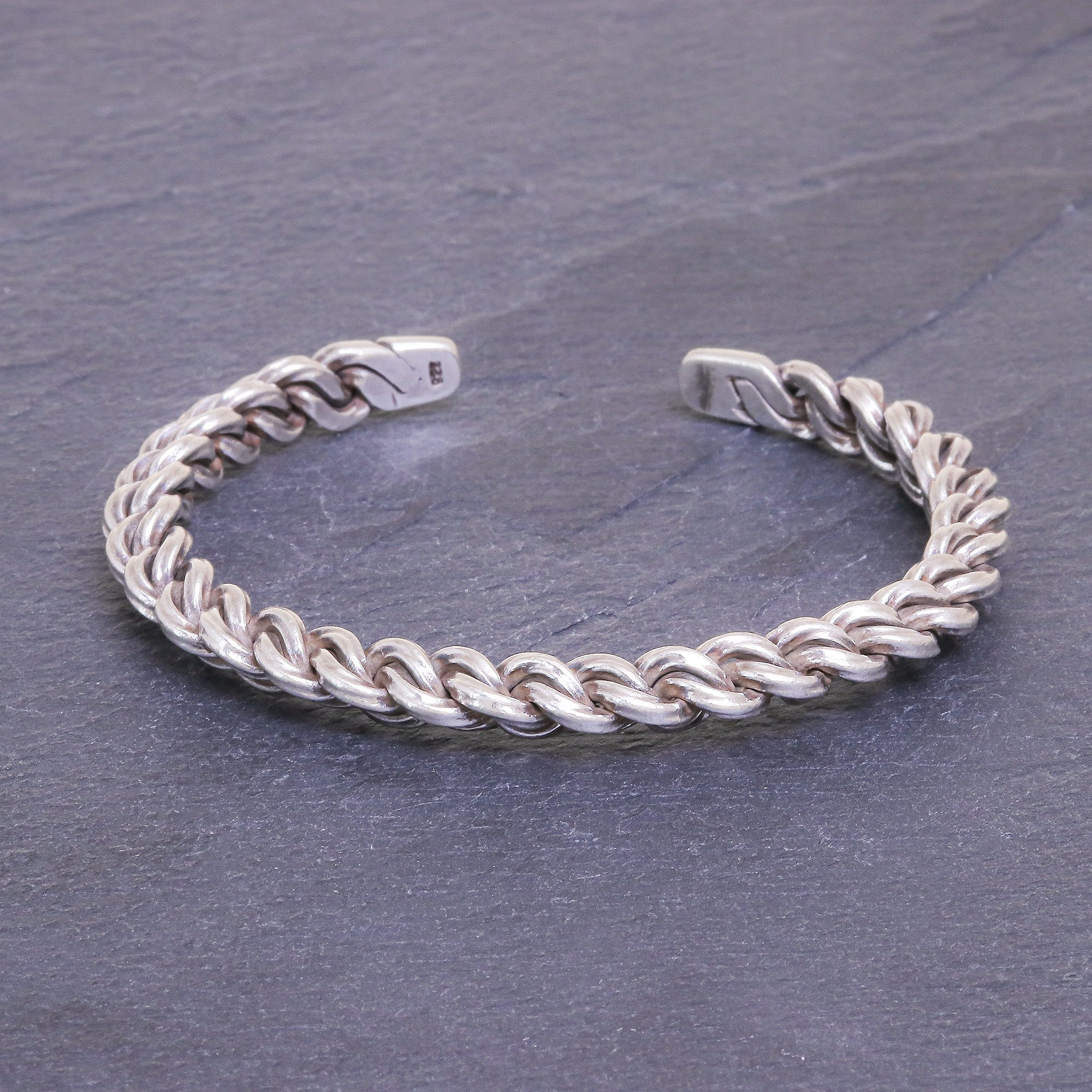 Handcrafted from sterling silver, this ropelike cuff bracelet makes a statement by itself while being neutral enough to pair with other bracelets. Pakaon Sojintarit of Thailand weaves the silver to resemble a linked chain.