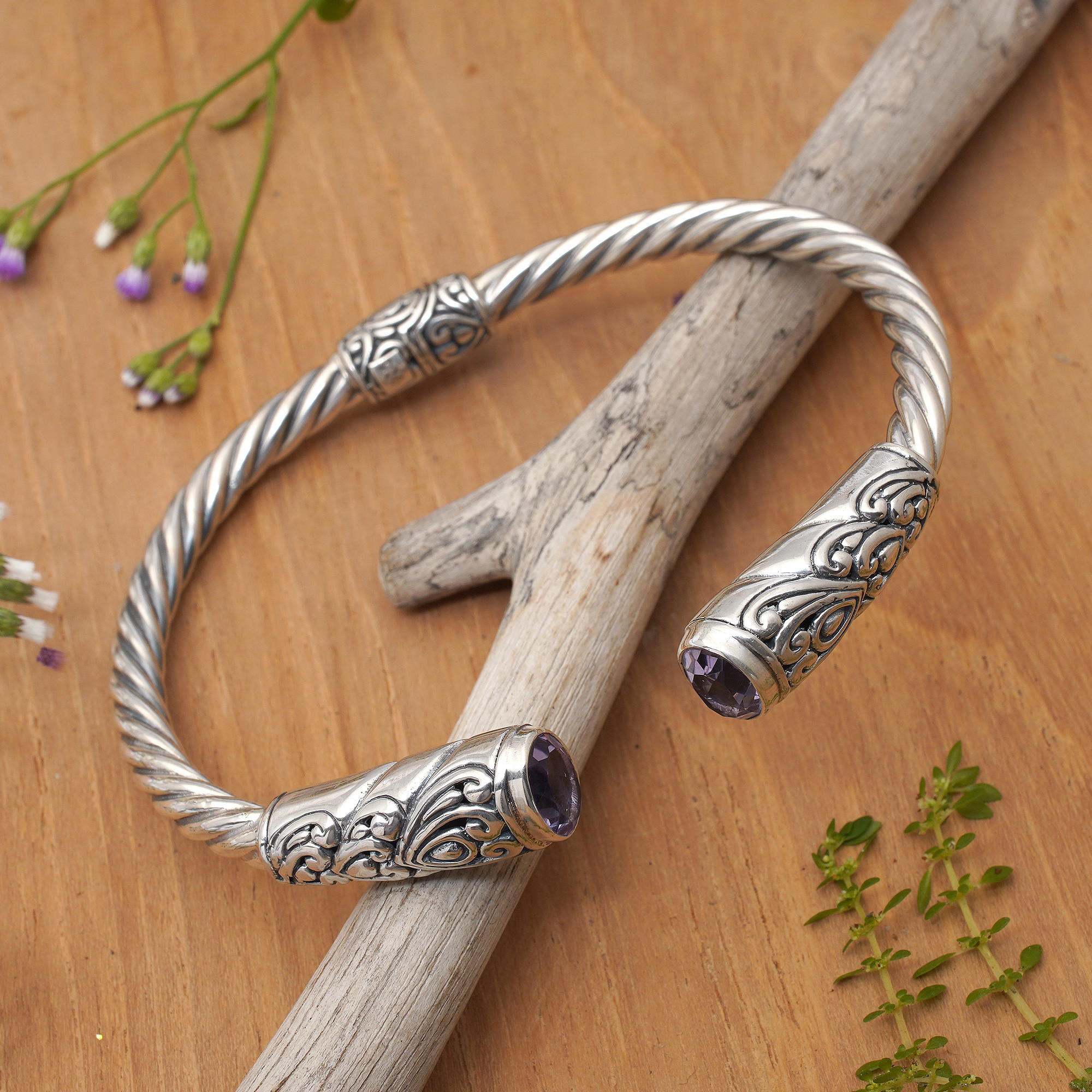 Amethysts crown the heart totems engraved on this stunning cuff bracelet by Wayan Neri. She crafts the sterling silver bracelet with classic Balinese patterns and 2.5 gemstone carats. An ornate hinge at the center facilates putting the cuff on and taking it off.