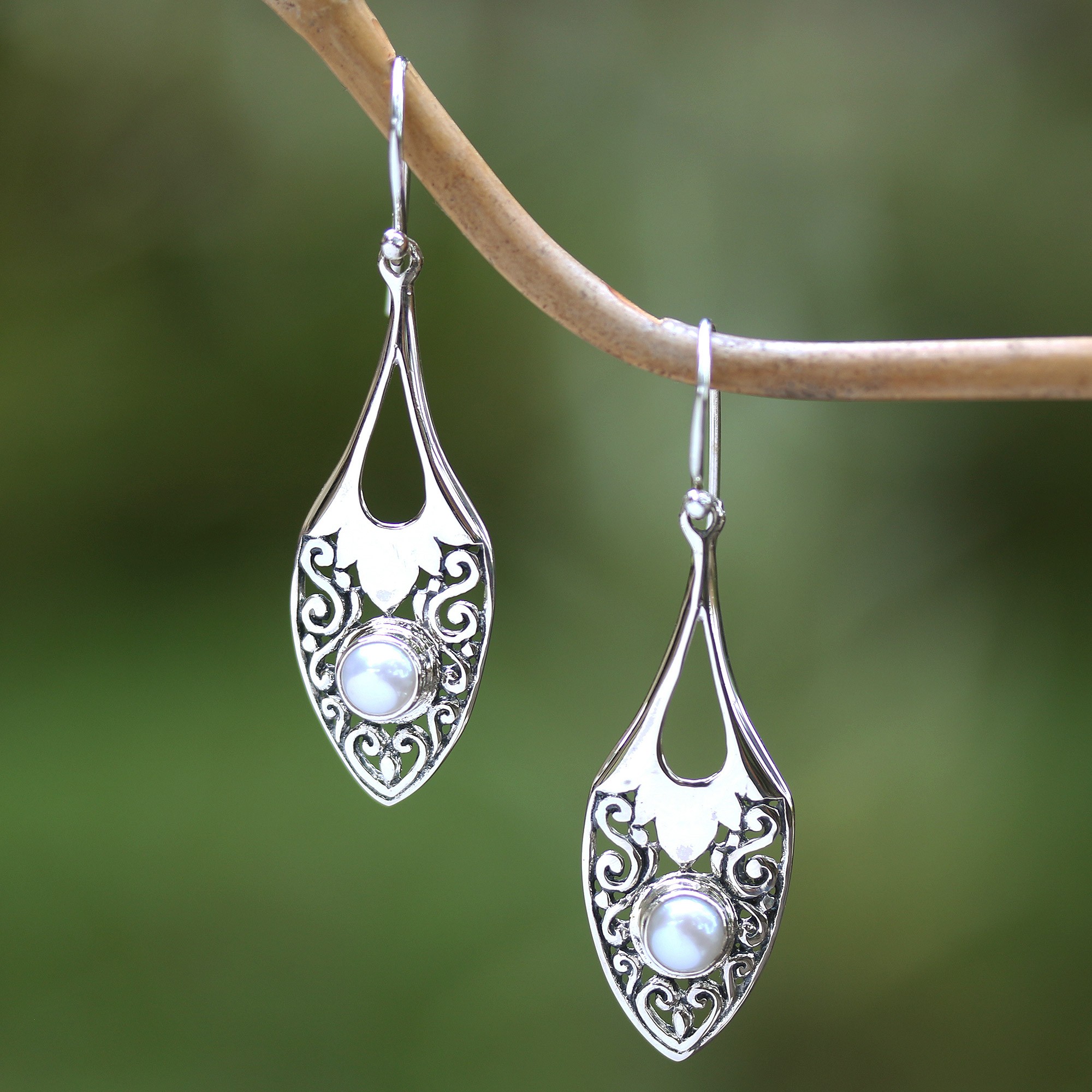 The glowing beauty of the full moon is captured in this pair of dangle earrings by Indonesia's Wirabhuwana. Each luminous cultured pearl is surrounded by Balinese motifs in sterling silver for an awe-inspiring look that catches the eye.