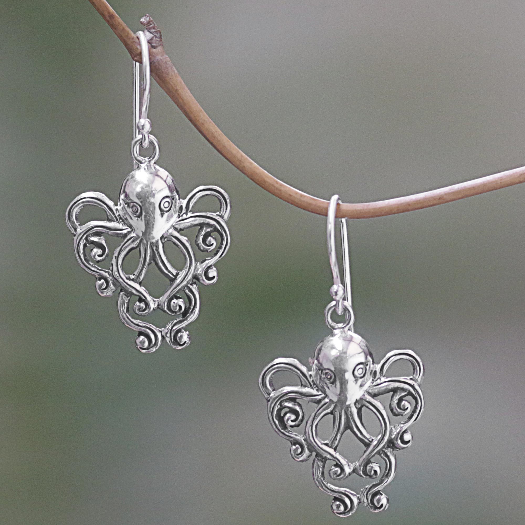 Sterling Silver Dangle Earrings Octopus from Indonesia, 'Octopus of the Deep'