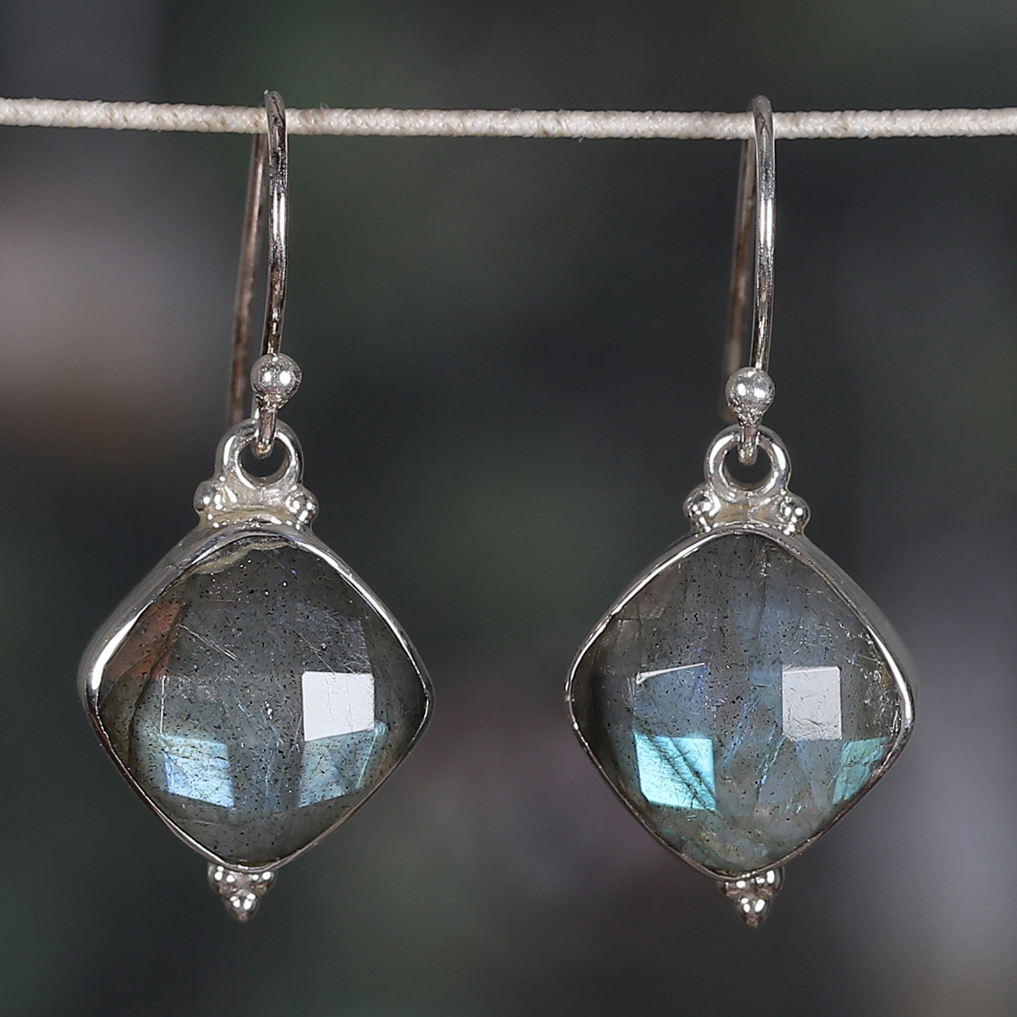 Arriving from distant Indian lands, these dangle earrings illuminate your ensembles with the grace of an evening kiss. Neeru Goel presents these sterling silver earrings, whose diamond shape holds natural labradorite jewels—totaling 33 carats of dapper light.