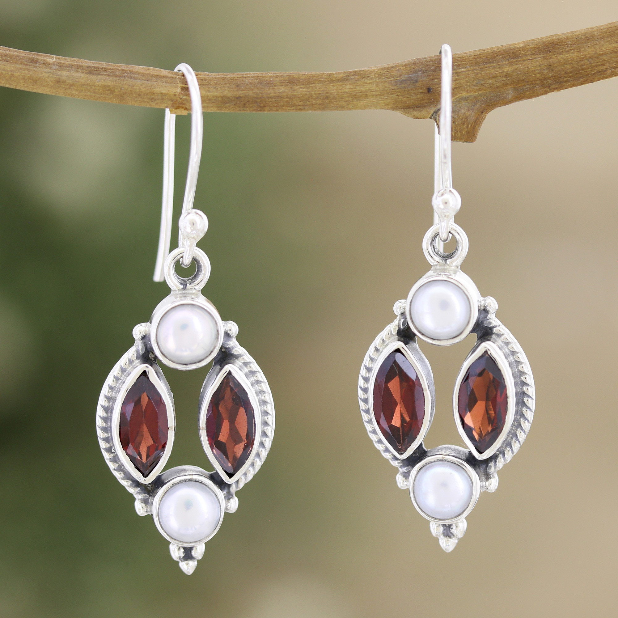 Sterling Silver Dangle Earrings with Cultured Pearl & Garnet, 'Elegant Mix'
