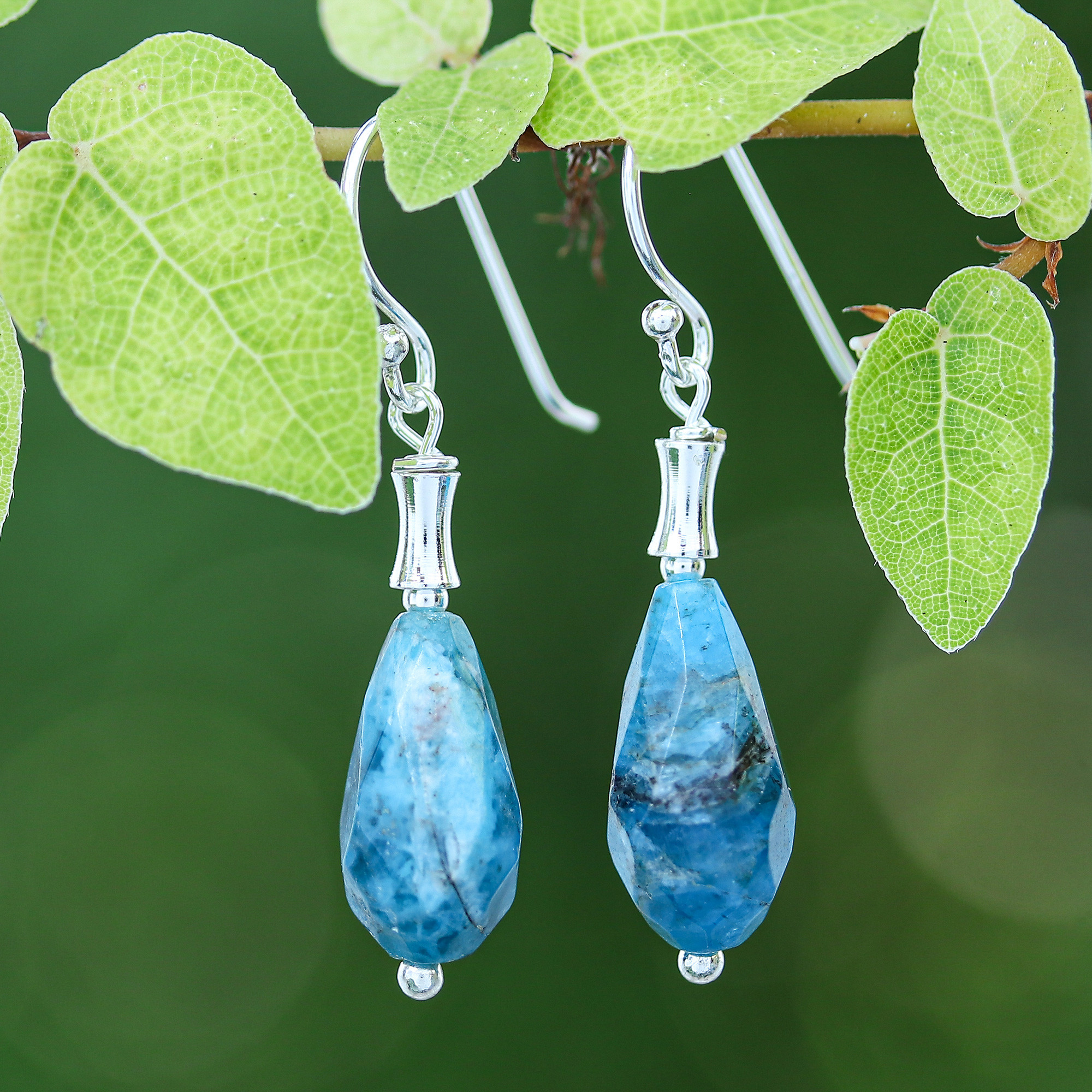 These sophisticated dangle earrings merge sleek sterling silver with the mesmerizing shades of faceted apatite, creating a dynamic interplay of light and color. Each teardrop stone dances with movement while the modern design by Thai artisan Sareeyakarn brings a fresh twist to timeless glamor – perfect for those who aren't afraid to make waves with their accessories.