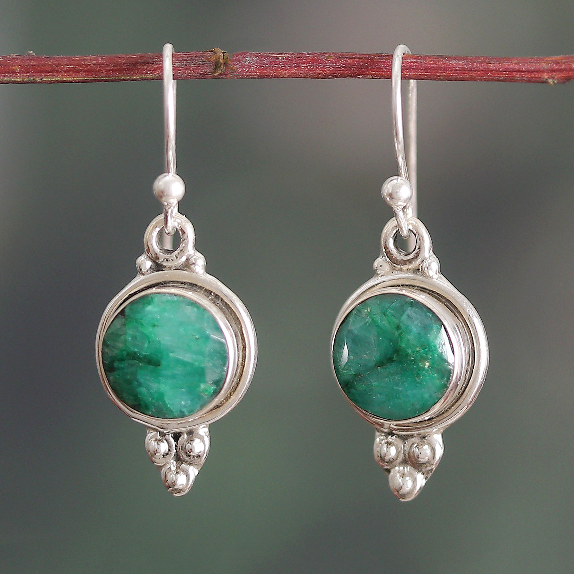 These sterling silver dangle earrings capture the perfect harmony between classic craftsmanship and eye-catching color. The emeralds sit like drops of lush forest atop brilliant silver, catching light with each movement and bringing a touch of nature's brilliance to your jewelry collection. Indian artisan Bhavya Jain's meticulous attention to detail ensures these gems cast their verdant spell from every angle.