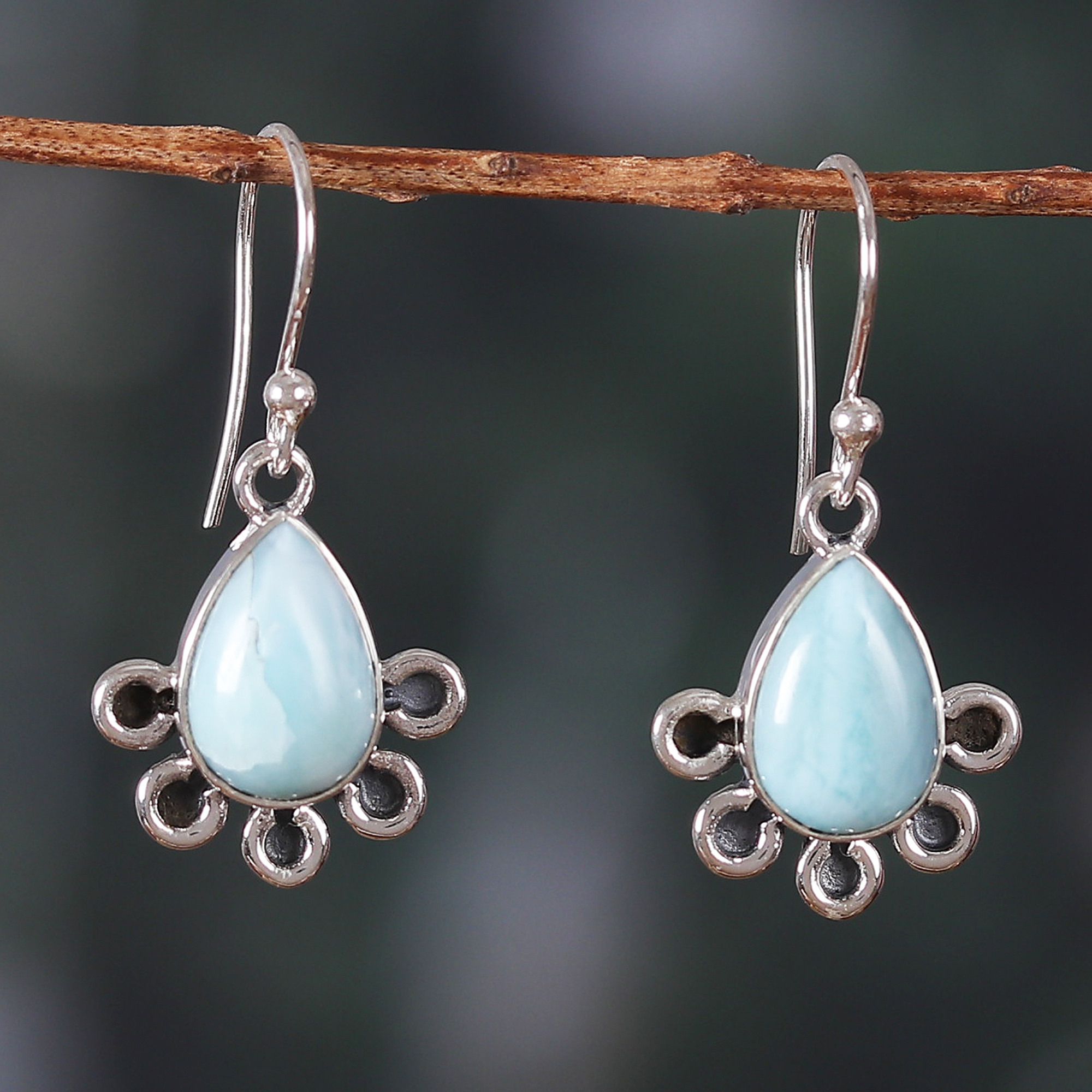 These eye-catching dangle earrings boast gorgeous larimar stones in breathtaking sky blue hues, infusing your look with radiance and glamor. India's Shanker presents these alluring earrings, crafted with intricate sterling silver shapes with an exquisite combination of oxidized and polished finishes.