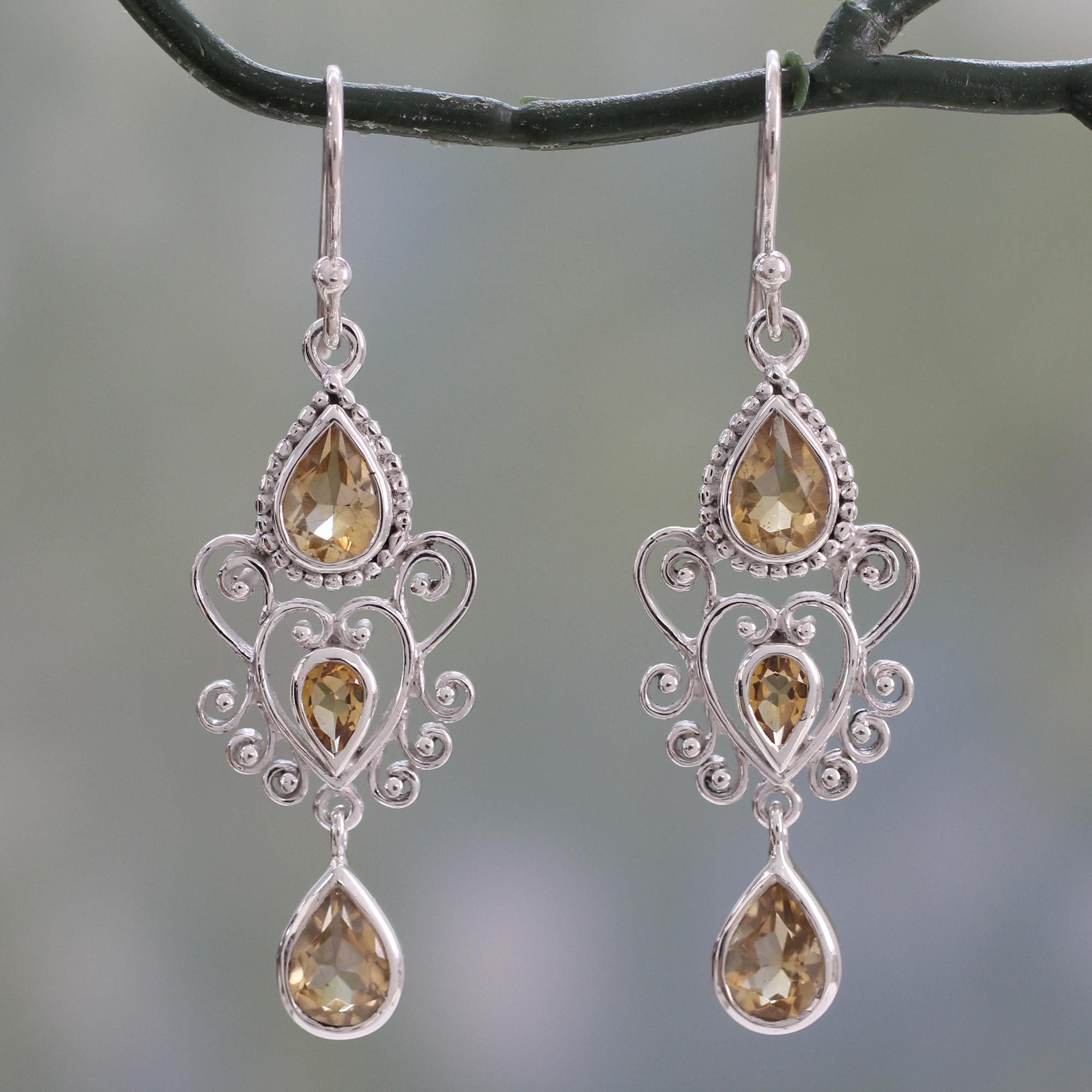 Cast your own spell of enchantment with these mesmerizing earrings from India's Shubhra Singh. Elaborate heart-shaped motifs in sterling silver are flanked top and bottom by teardrops of citrine. The dangle earrings feature over 3 carats of the golden gemstone, including smaller teardrops at the hearts' centers. The earrings sway on sterling silver hooks.