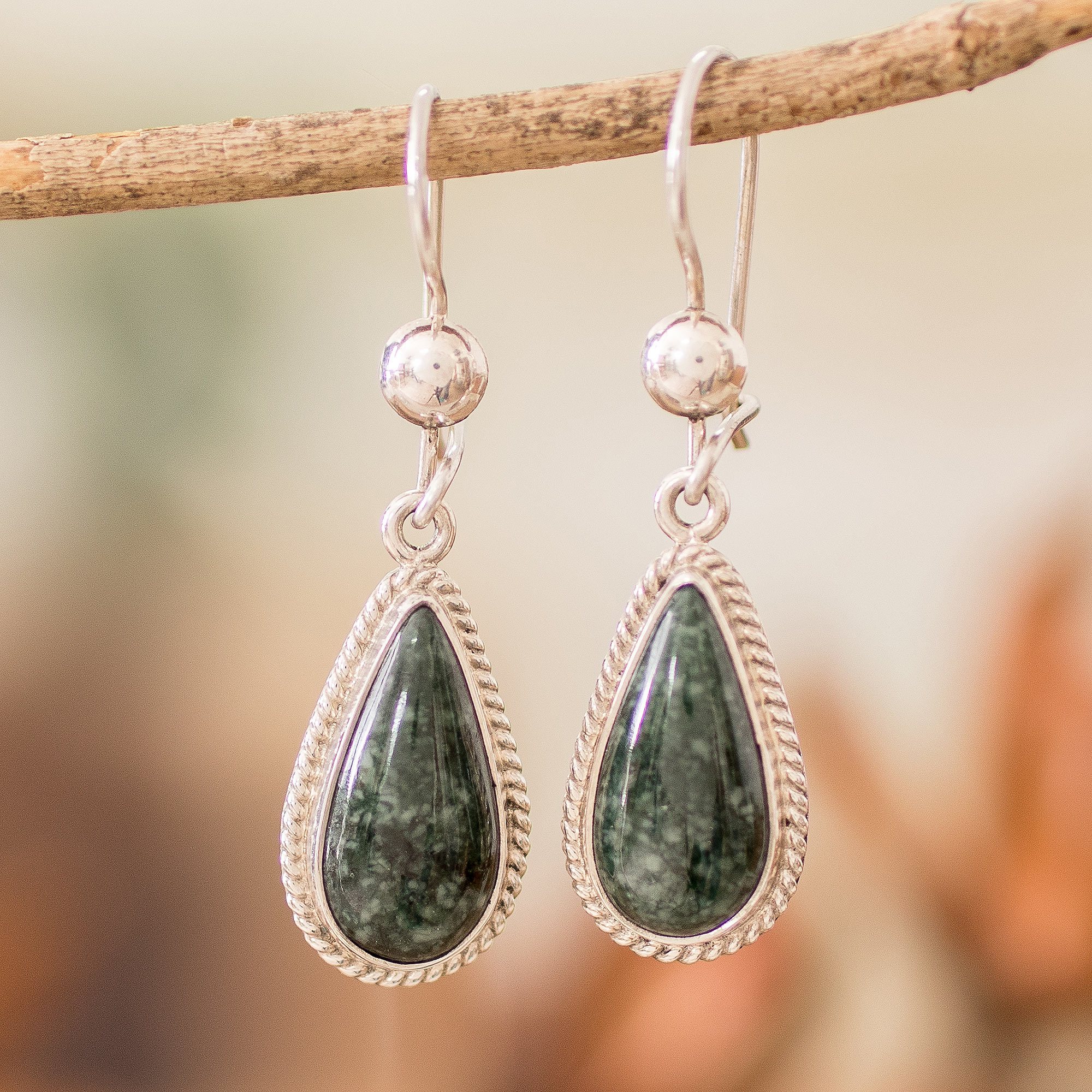Sterling Silver Dark Green Jade Drop-Shaped Dangle Earrings, 'Dark Green Sacred Quetzal'