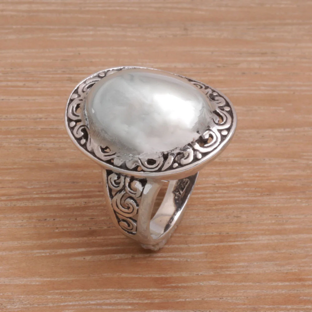 Dewa Arimbawa of Indonesia handcrafts a cocktail ring that celebrates the beauty of sterling silver. The band and crown feature Balinese style scroll work that surrounds a polished central dome.