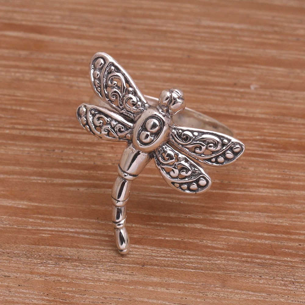 The elegant dragonfly is believed by some cultures to bring prosperity and harmony, and is considered a symbol of good luck. Artisan Suar Dwipayana offers that fortune to you with this wonderful cocktail ring, that is handcrafted from sterling silver. Resting on a smooth band, the silver dragonfly displays its wings that are decorated with traditional Balinese bun openwork.