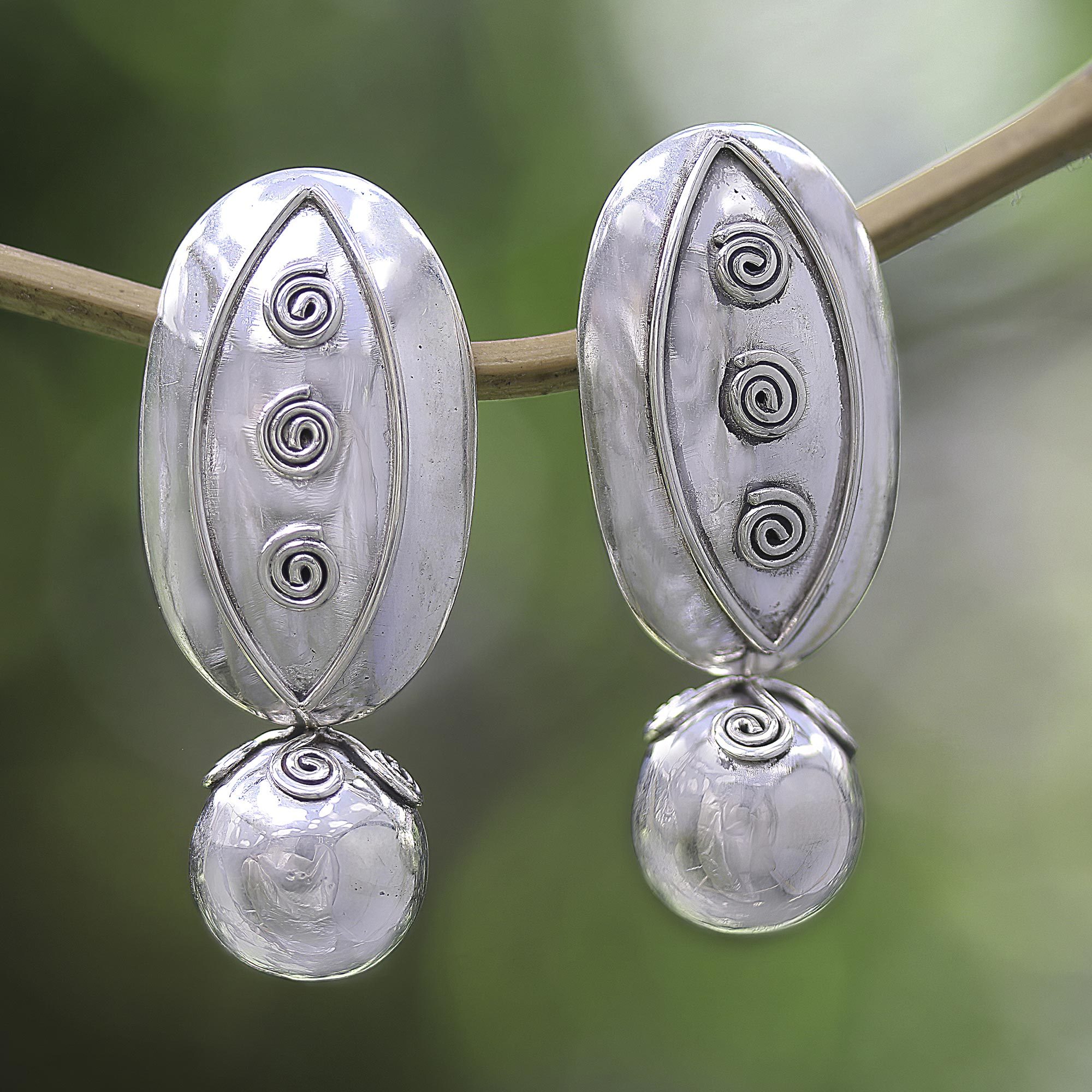 Sterling Silver Drop Earrings with Spiral Motif, 'Gleaming Baubles'
