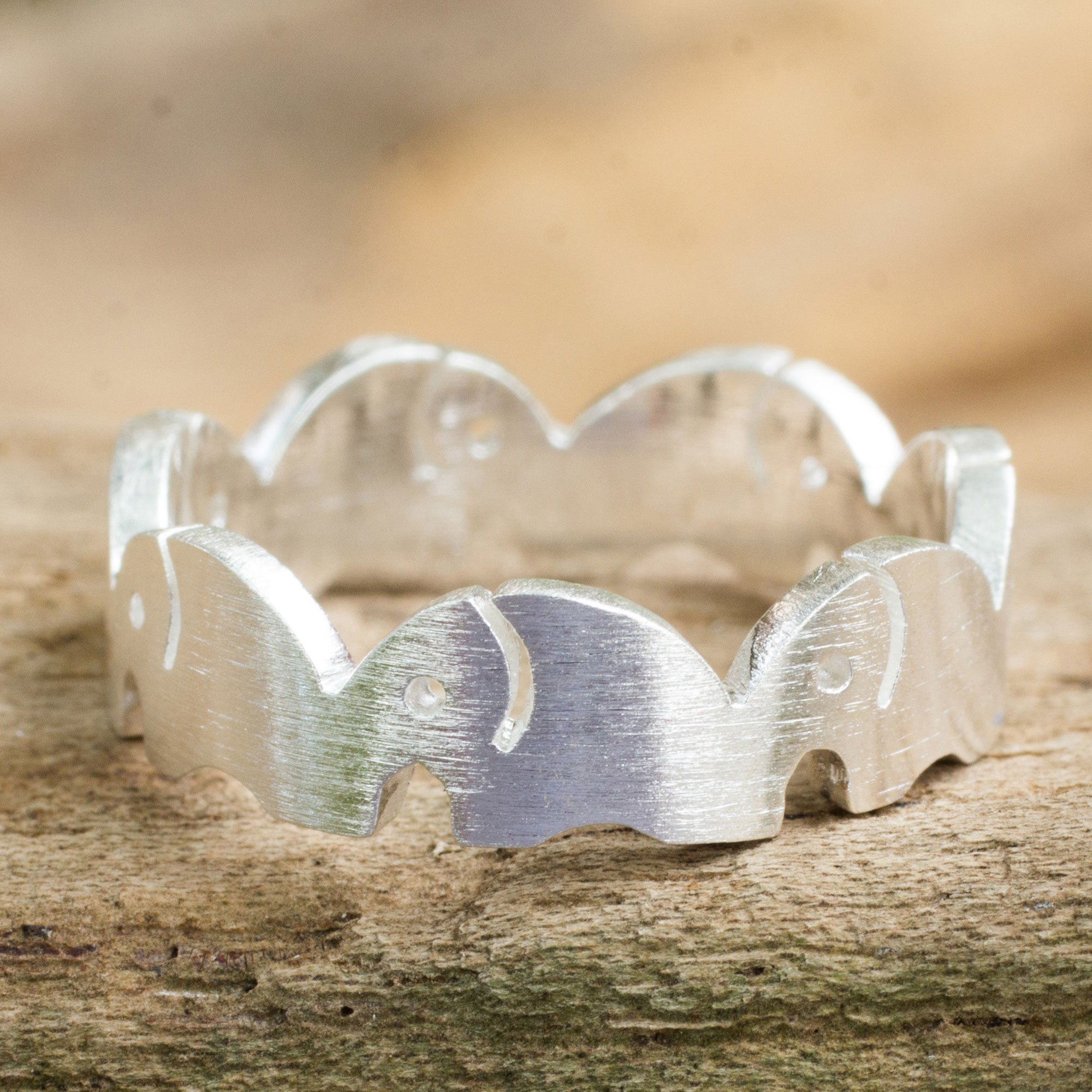Sterling silver elephants parade in a circle shaping this lovely ring. Thailand's Jantana designs the ring, which is crafted with a brushed satin finish on the exterior.