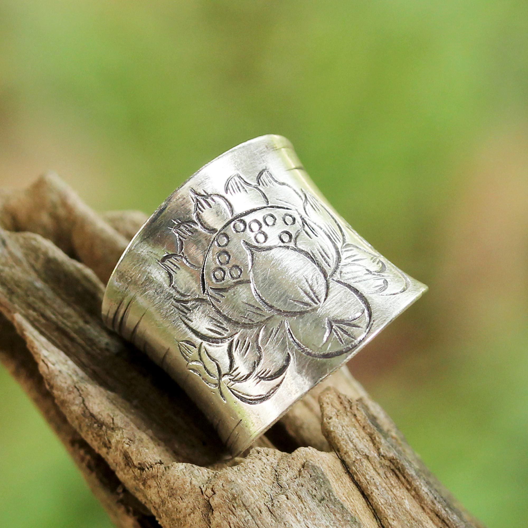 Sterling Silver Etched Lotus Wrap Ring from Thailand, 'Lanna Lotus'
