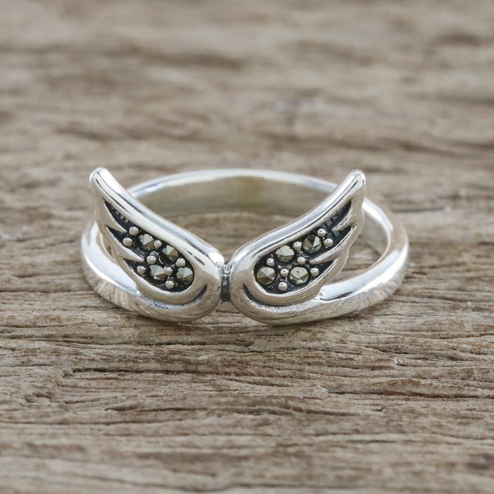 Thailand's Narinee creates a beautiful ring that embodies the concept of freedom. A sterling silver band joins two wings, ready to take flight. Faceted marcasite adds its luminous sparkle to your look.