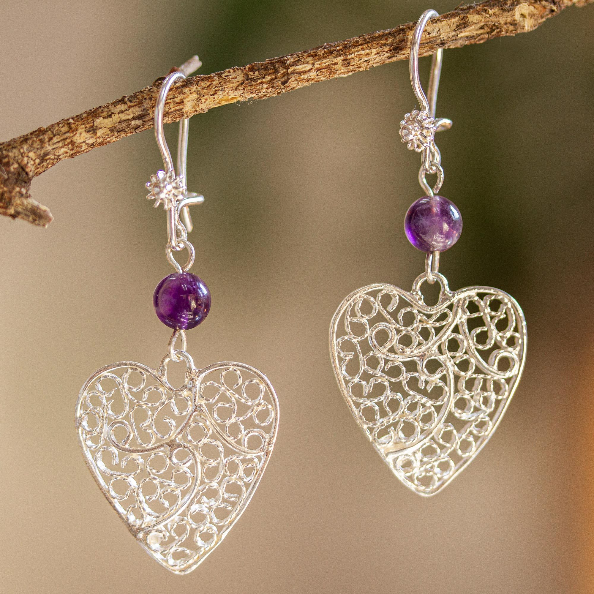 Suspended from kidney earwires, polished amethyst beads anchor dimensional sterling silver filigree hearts. These dangle earrings, the original design of Mexico's Eva Souto, are suitable for special occasions and everyday wear alike.