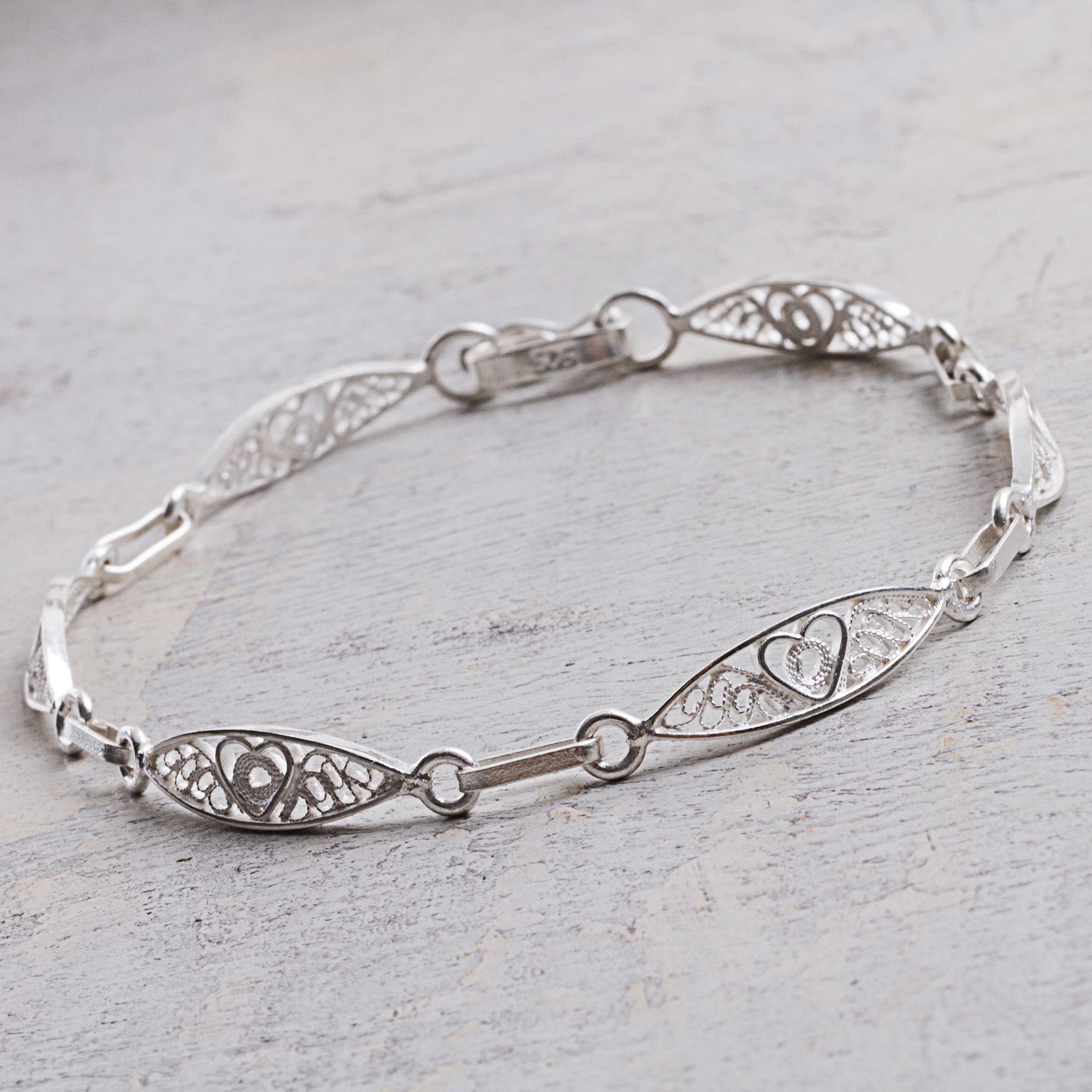 Petite heart shapes are featured in each link along the length of this Peruvian bracelet. Designed by Alfredo Inga, the link bracelet is handcrafted from sterling silver, with elegant, spiraling filigree motifs.