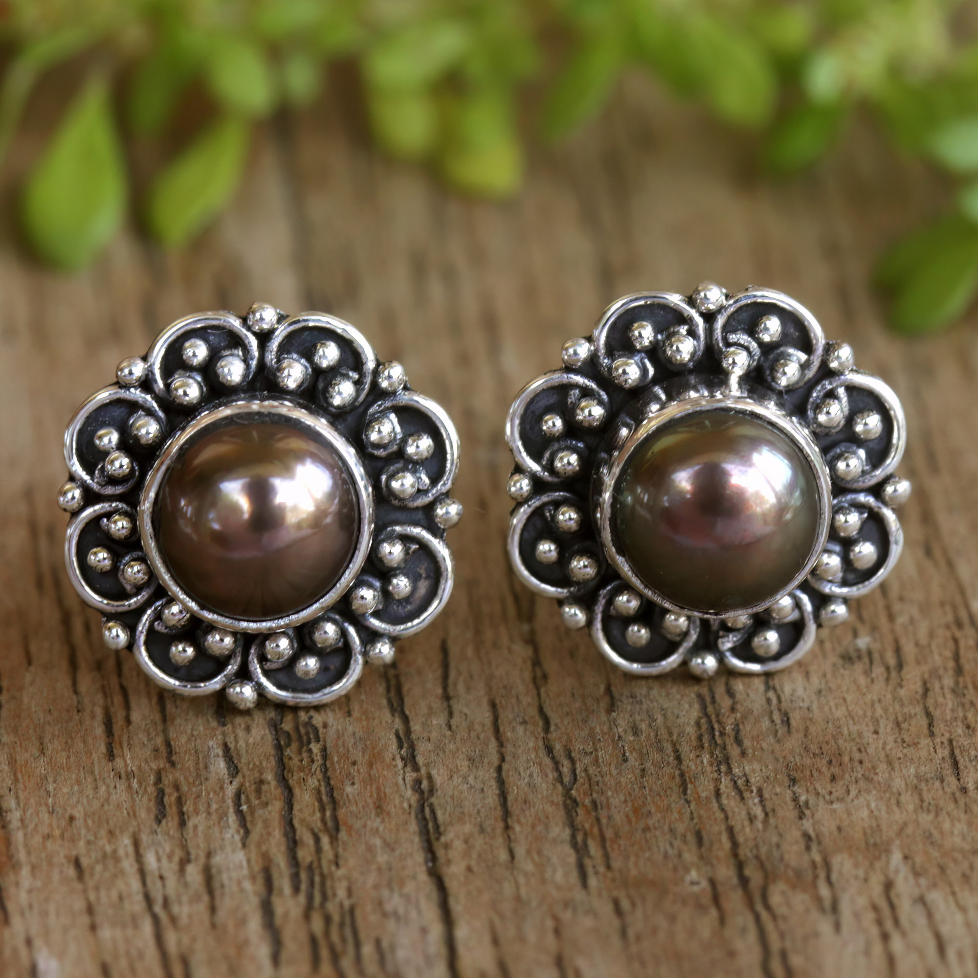 Bali's Ketut Sulastri designs a pair of delicate sterling silver stud earrings shaped like flowers and featuring brown cultured pearls for a stylish look. Around the cultured pearls we can find silver dots and a combination of oxidized and polished finishes that highlight the craftsmanship of Balinese artisans and their mastery of the classic granulation technique.
