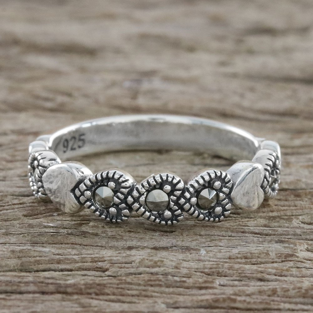A crown of celestial hearts graces the front of this gorgeous ring, handcrafted by Thailand's Narinee. The band is created from sterling silver while the hearts contain tiny faceted marcasite gems.