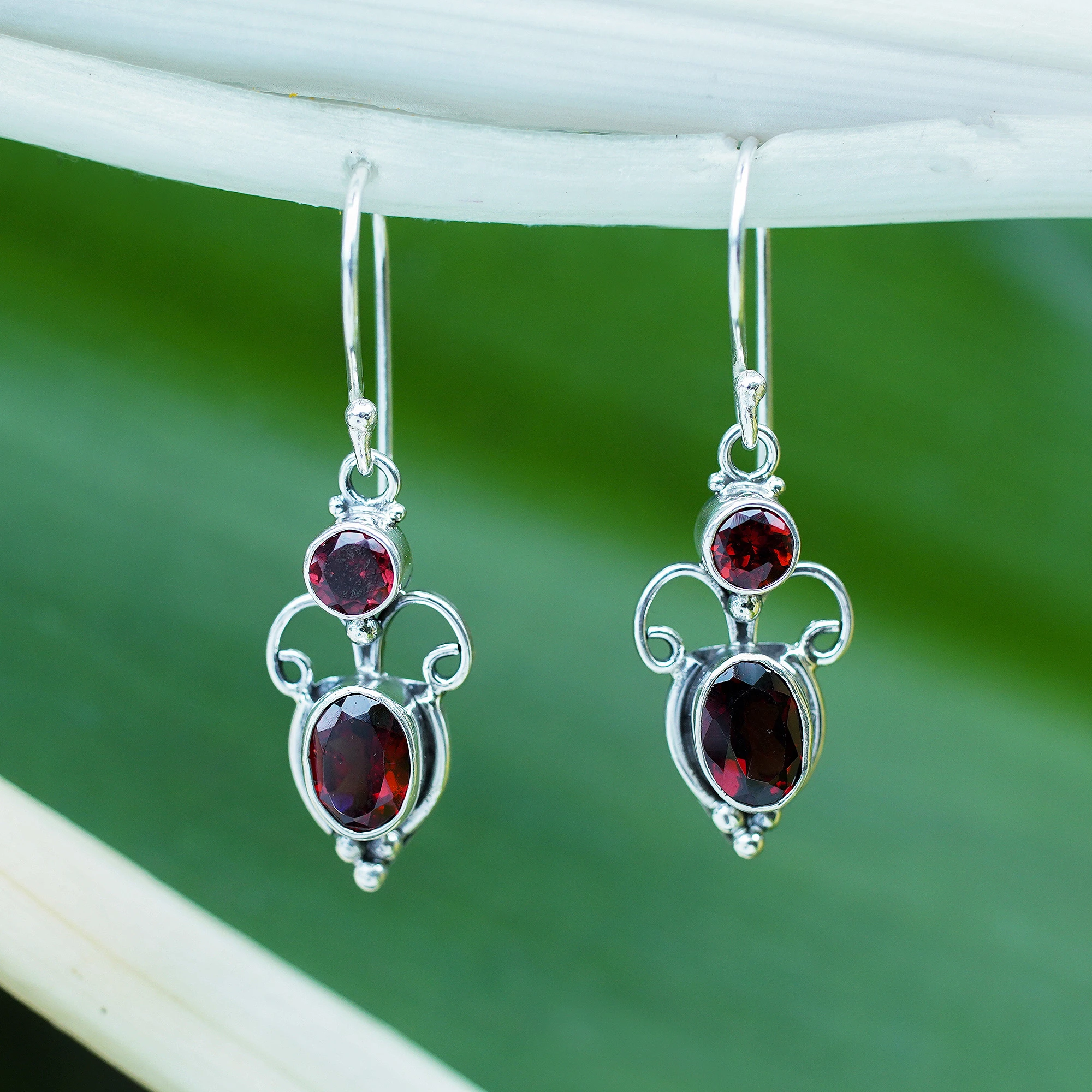 Symmetrical and beautiful, this design is regal in its styling. From Kenari, the earrings feature faceted garnets embraced by sterling silver tendrils.