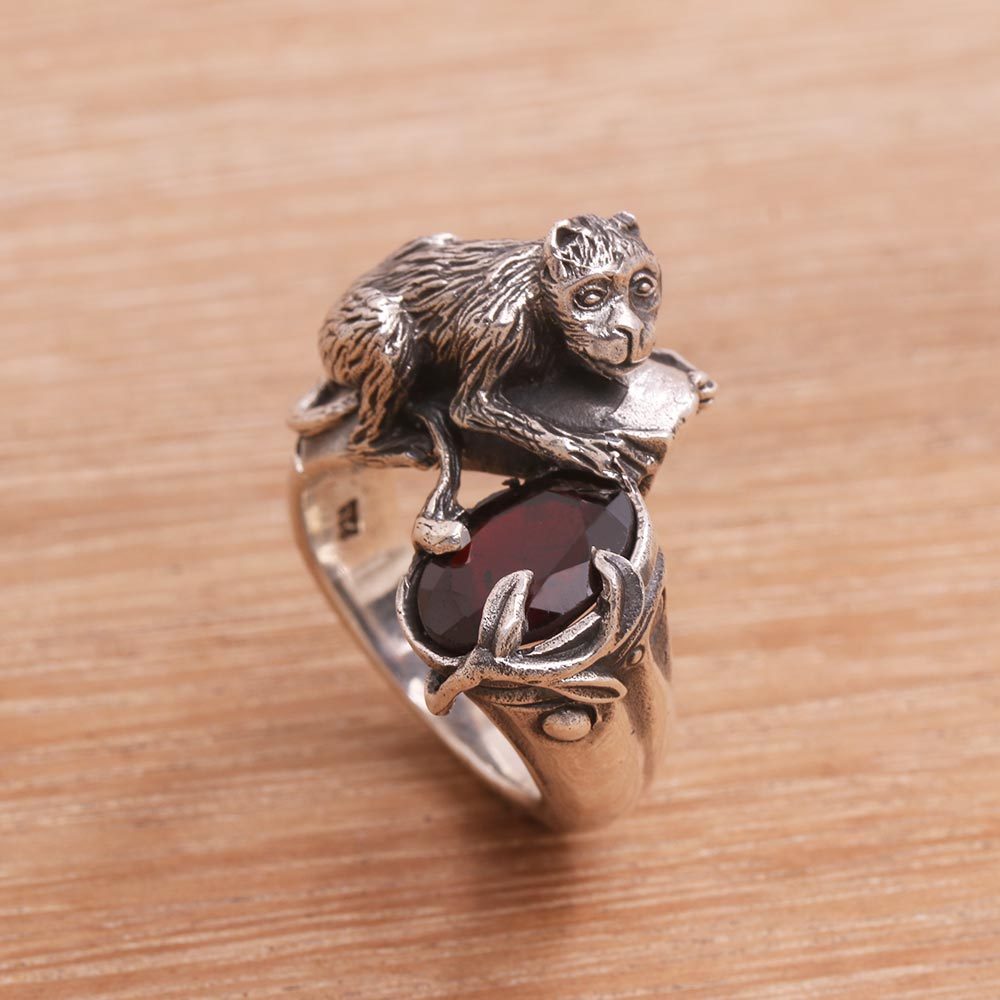Celebrating one of Bali's native species, Indonesian artisan Dewa Arimbawa presents this stunning cocktail ring. A sterling silver monkey hangs upon a tree branch of over two carats of faceted garnet. The detail of the fur and features displays the pride of craftsmanship. The artist calls this accessory Bojog, which means "monkey" in Indonesian.