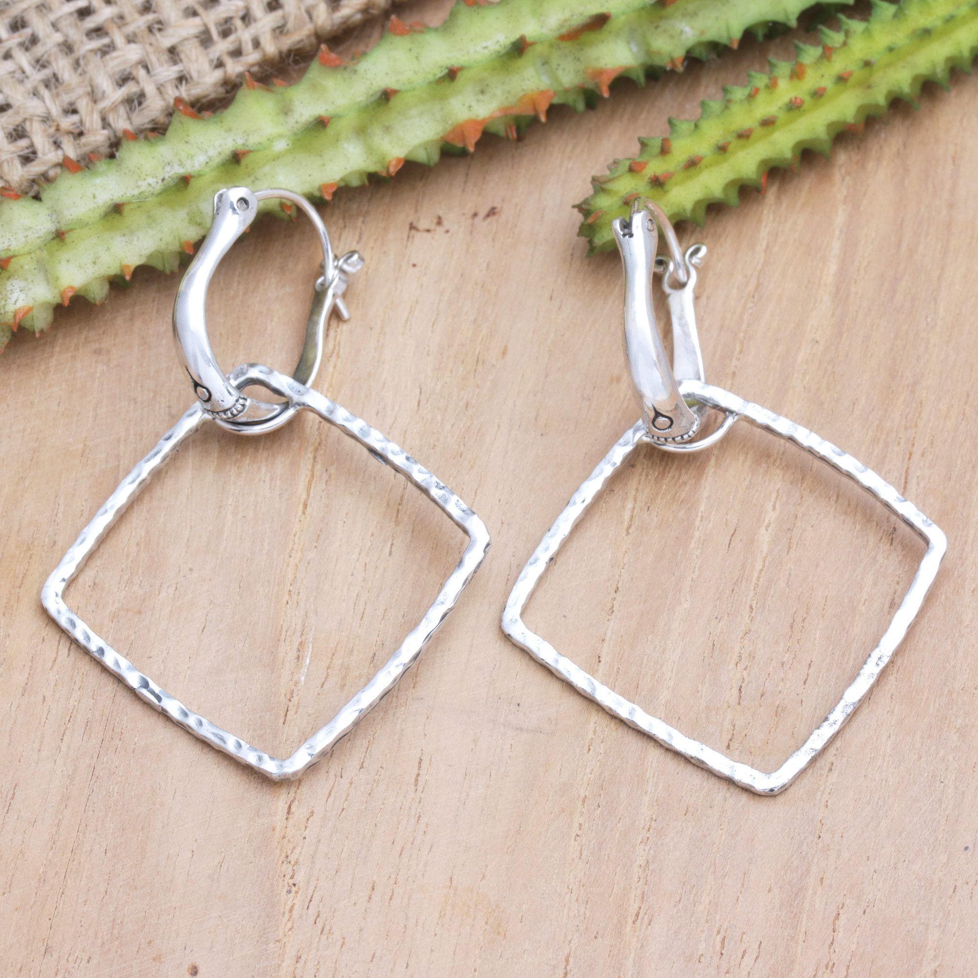 Add a modern touch to your outfits with these sterling silver dangle earrings crafted in Bali by Dewa Arimbawa. Featuring geometric formation in a hammered finish, the accessory also presents little hoops for a unique look.