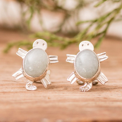 Sterling Silver Green Jade Earrings with Sea Turtle Motif, 'Light Green Marine Turtles'