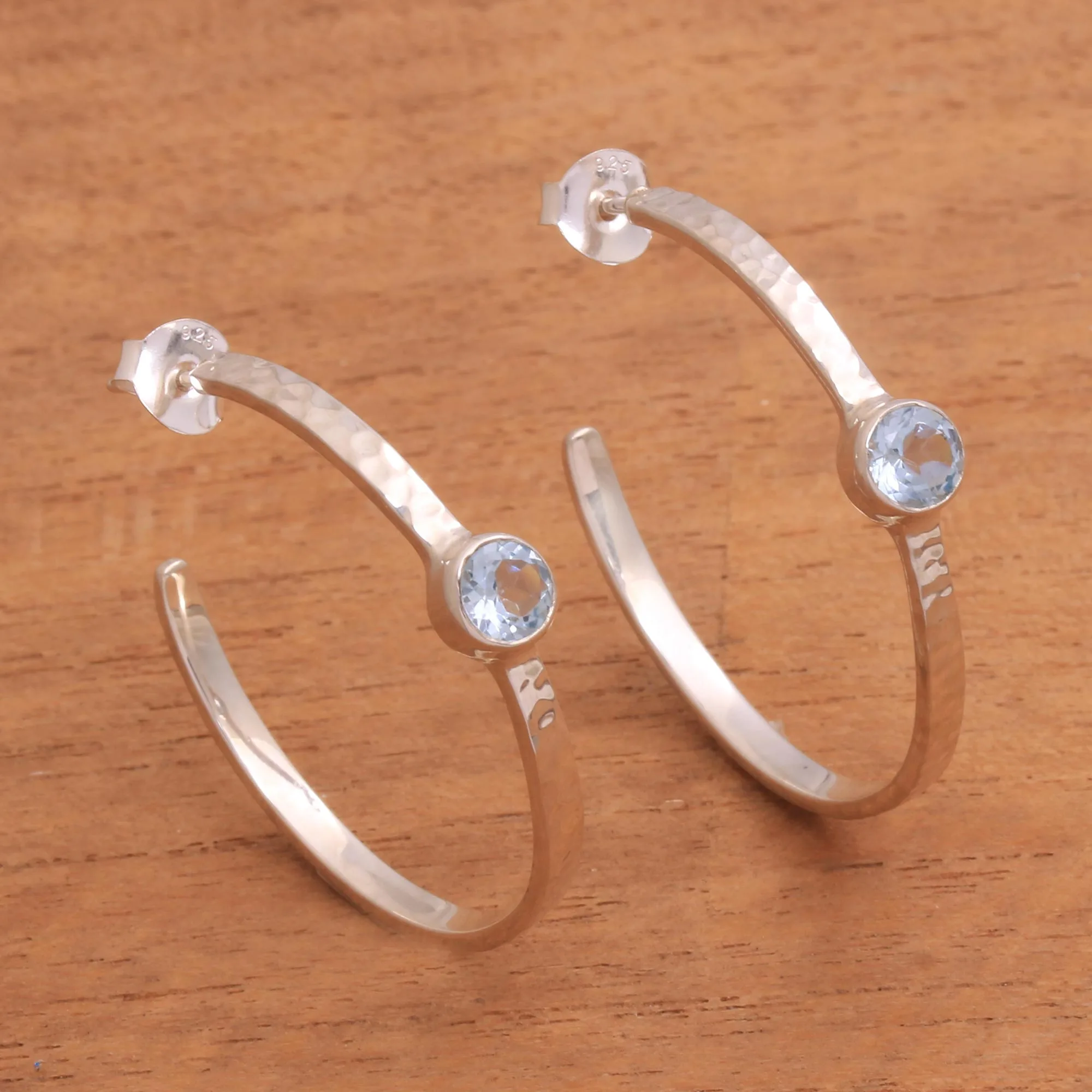Sterling Silver Hammered Blue Topaz Half-Hoop Earrings, 'Pretty Paradox'