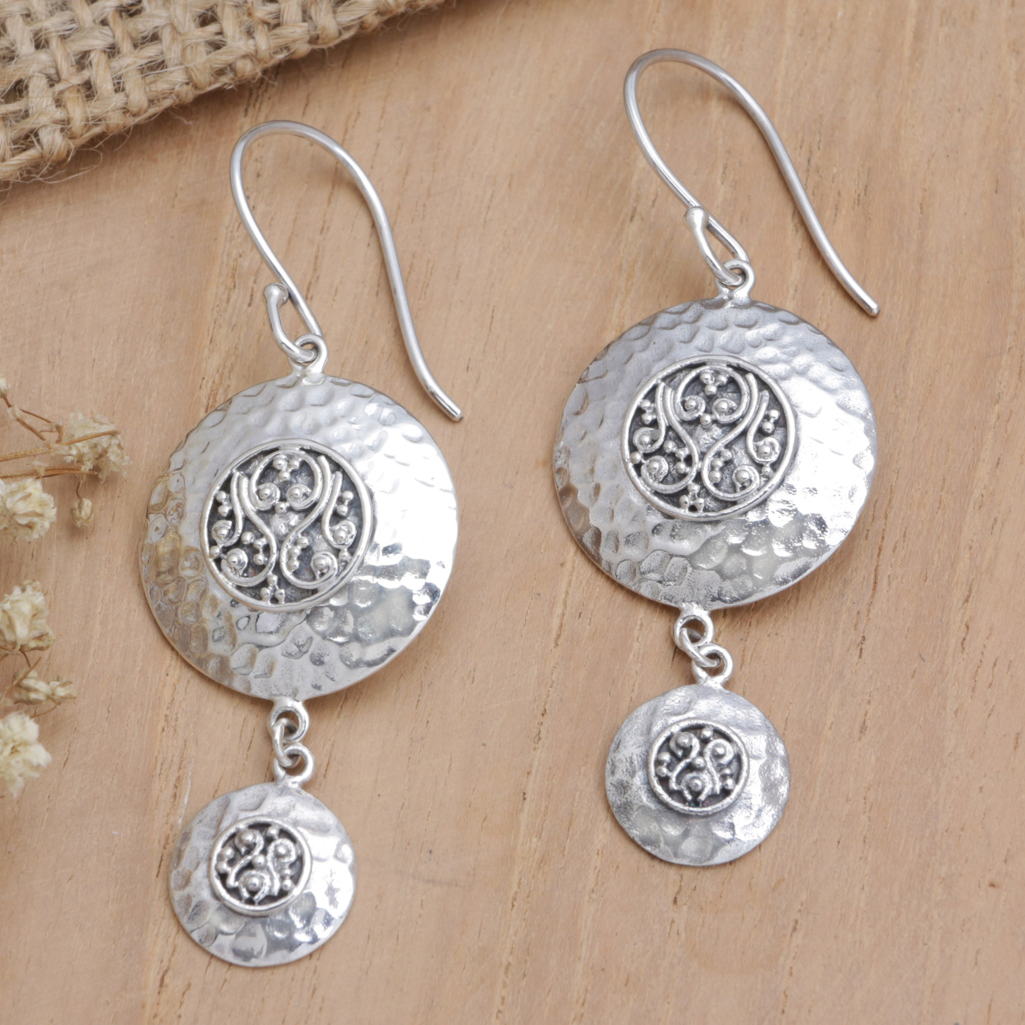 A hammered finish ornaments the discs of these dangle earrings handcrafted by Ketut Udiana in Bali. Working with sterling silver, the artisan adds spiral motifs, making a dazzling creation perfect for any occasion.