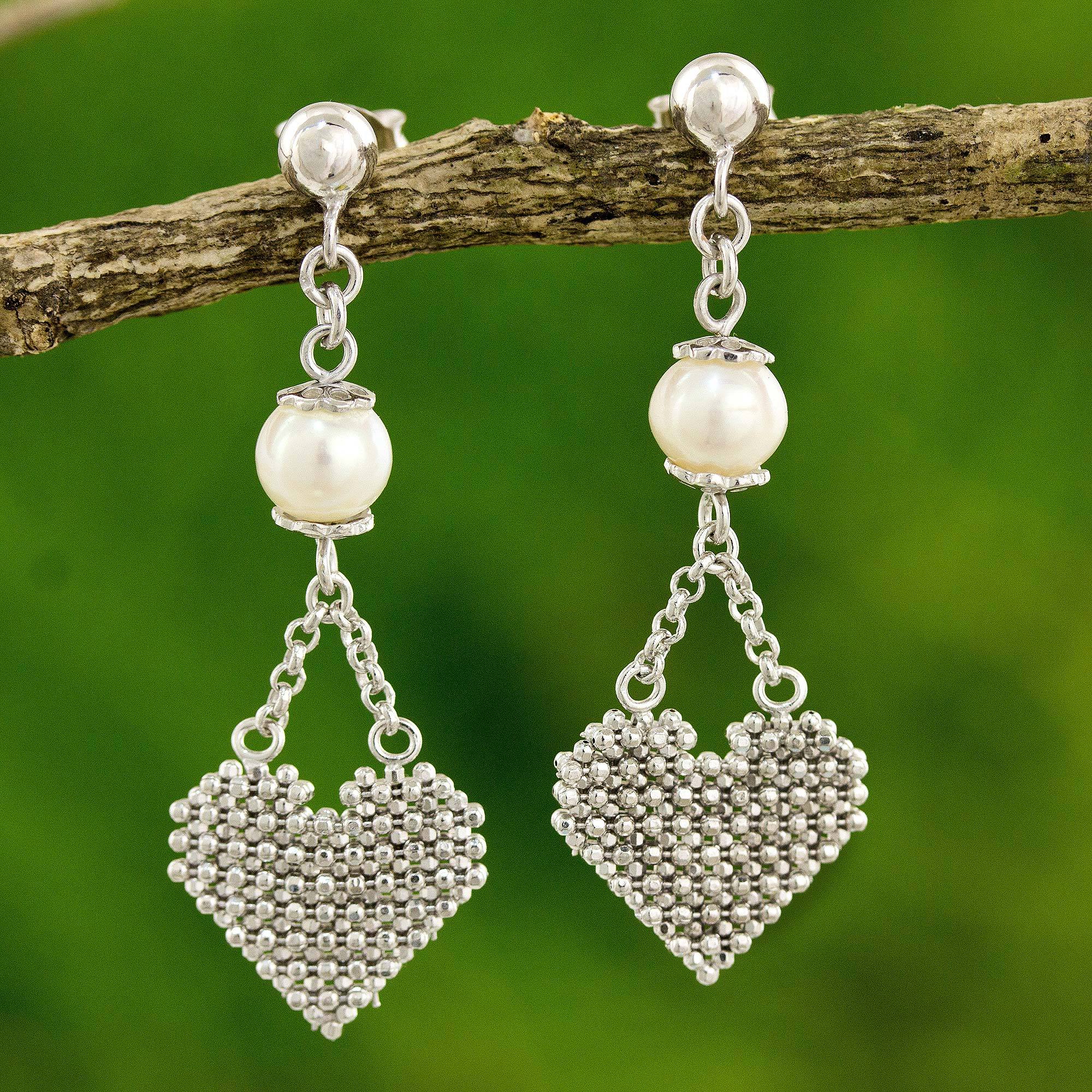 Angels celebrates love and romance with the design of these heart earrings. The Thai artisan expertly handcrafts the sterling silver earrings featuring white iridescent pearls for a harmonious contrast.