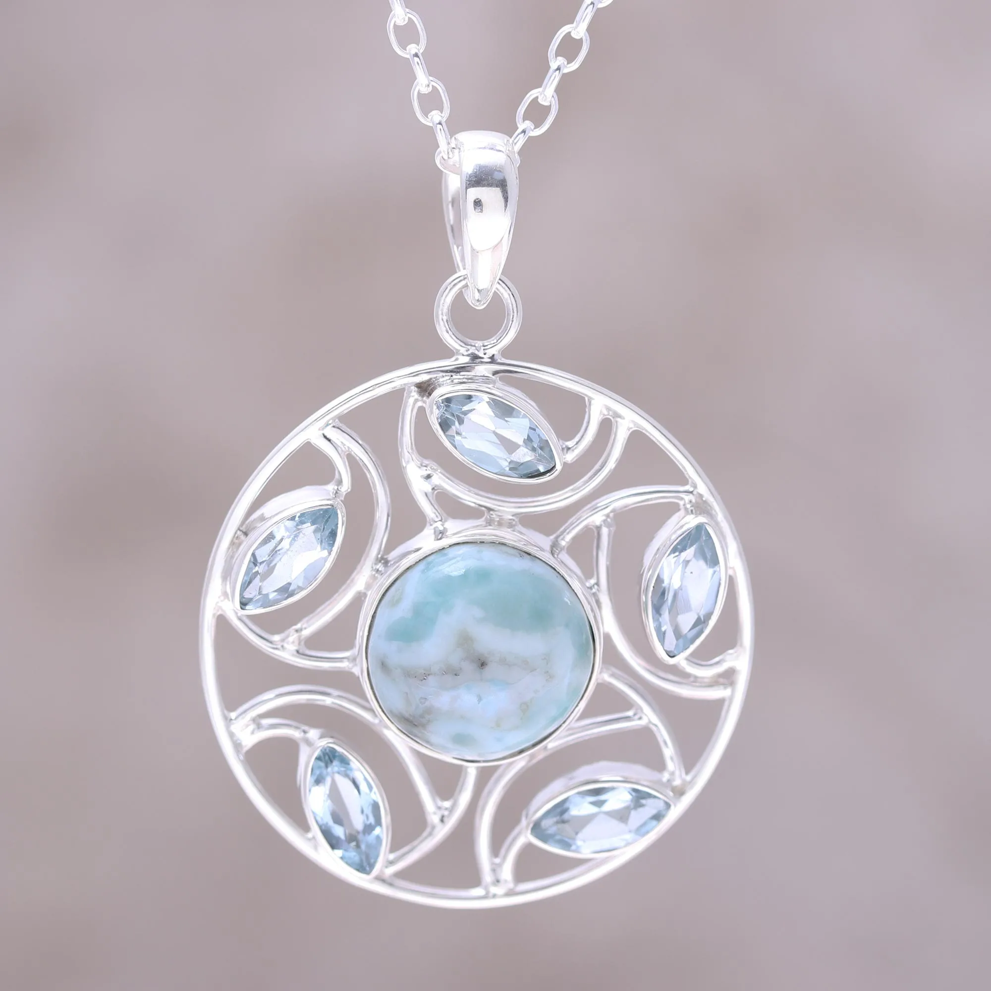 Sterling Silver Larimar Blue Topaz Round Pendant Necklace, 'Blue Wheel'
