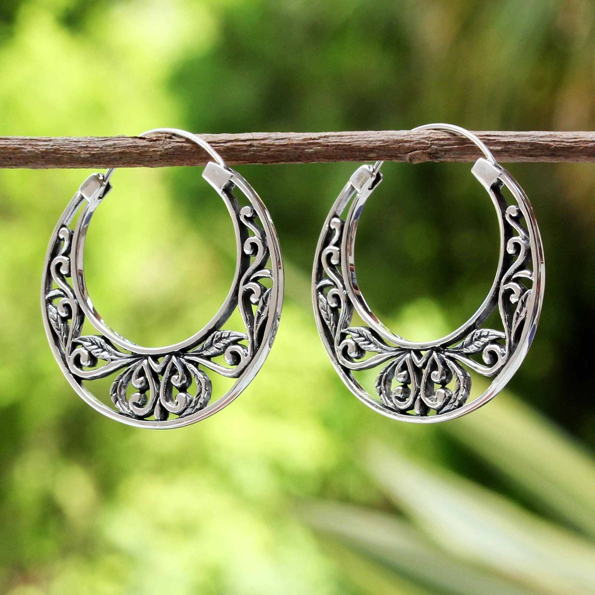 Ornate and beautiful, these hoop earrings from Thailand are crafted of sterling silver by local artisans, with beautifully-realized openwork. Lalana invites you on a journey to a leafy spring with this pair of elegant earrings.