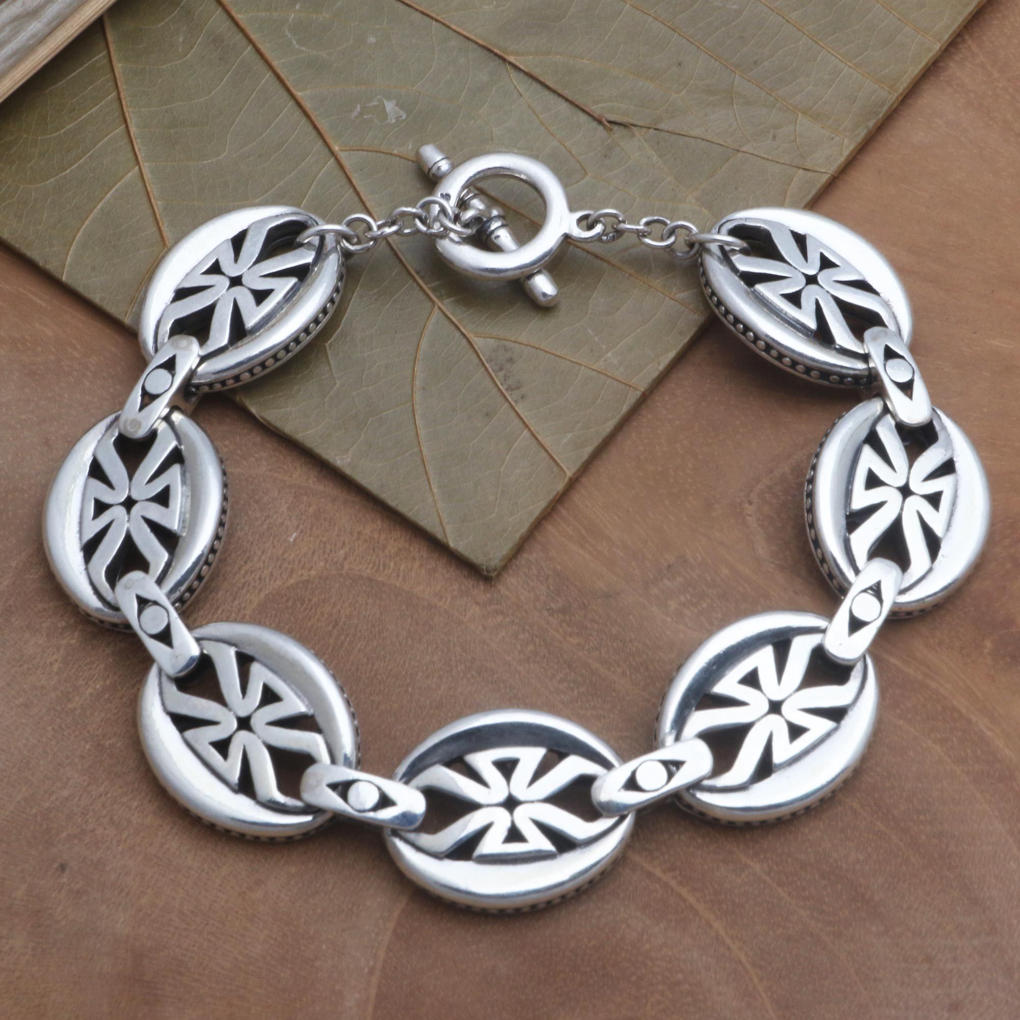 With a shape reminiscent of the Union Jack, the links in this bracelet are crafted of polished sterling silver and feature beaded edges. Dewa Arimbawa of Bali creates the original bracelet design.
