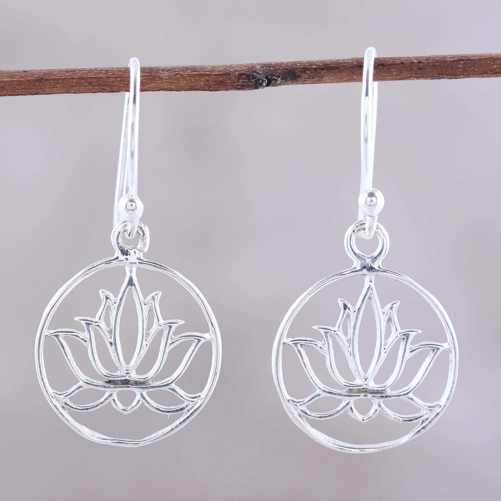Sterling Silver Lotus Dangle Earrings from India, 'Delightful Lotus'