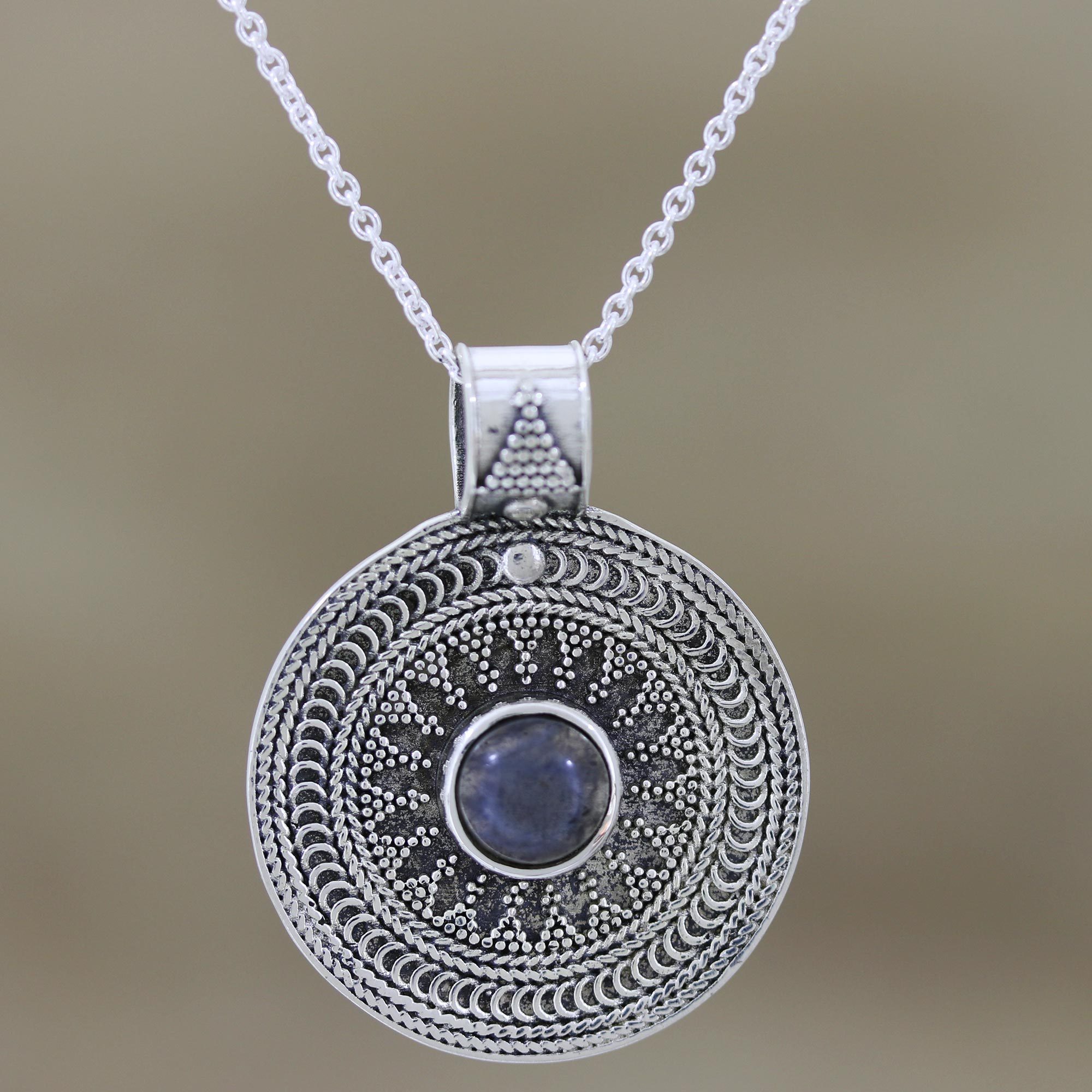 Sterling Silver Medallion Pendant with Labradorite Cabochon, 'Lunar Love'