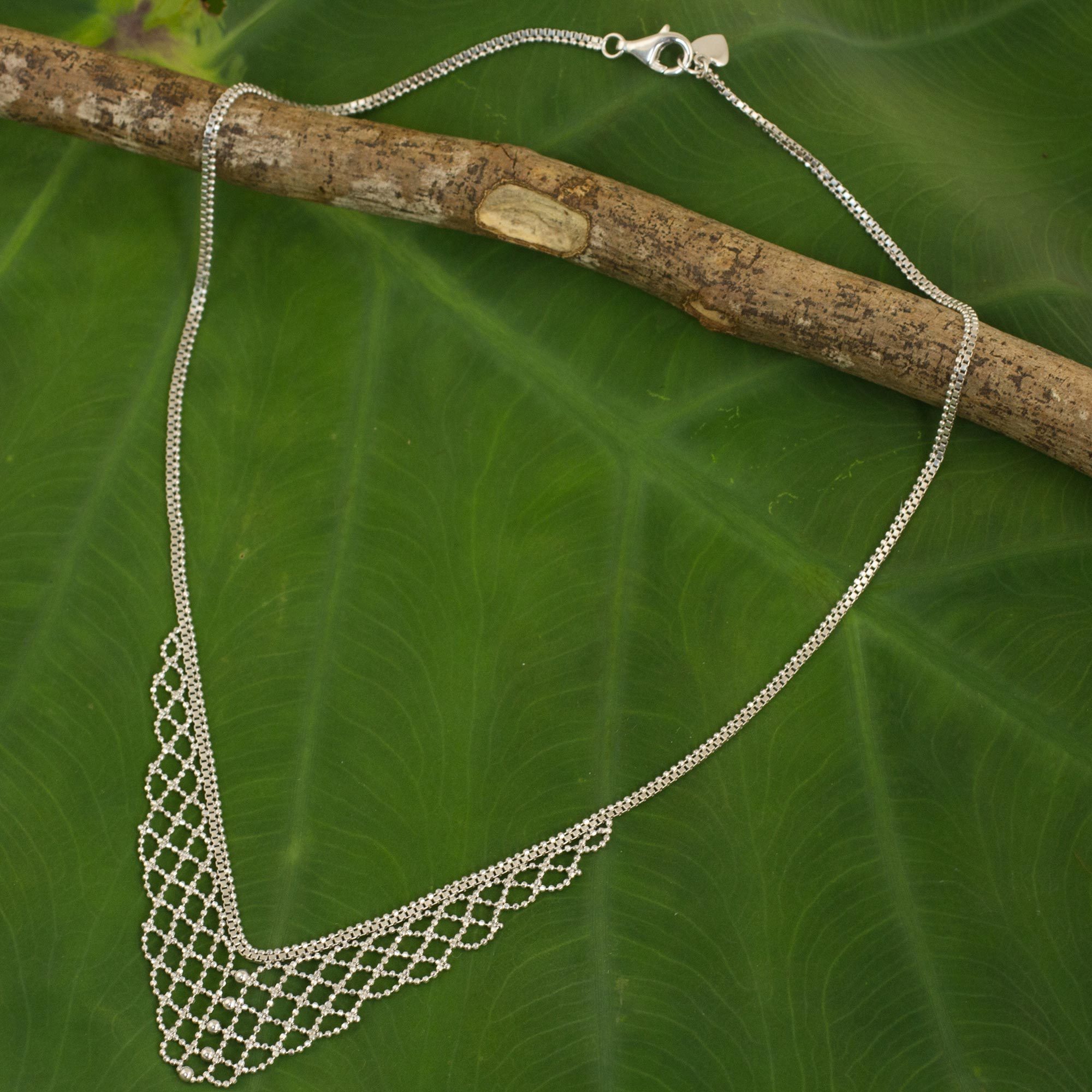 Thai artisan Angels creates the illusion of a vintage lace collar with her original necklace design. The lace-like necklace is crafted using sterling silver ball chain and box chain, with round silver beads adorning the center.