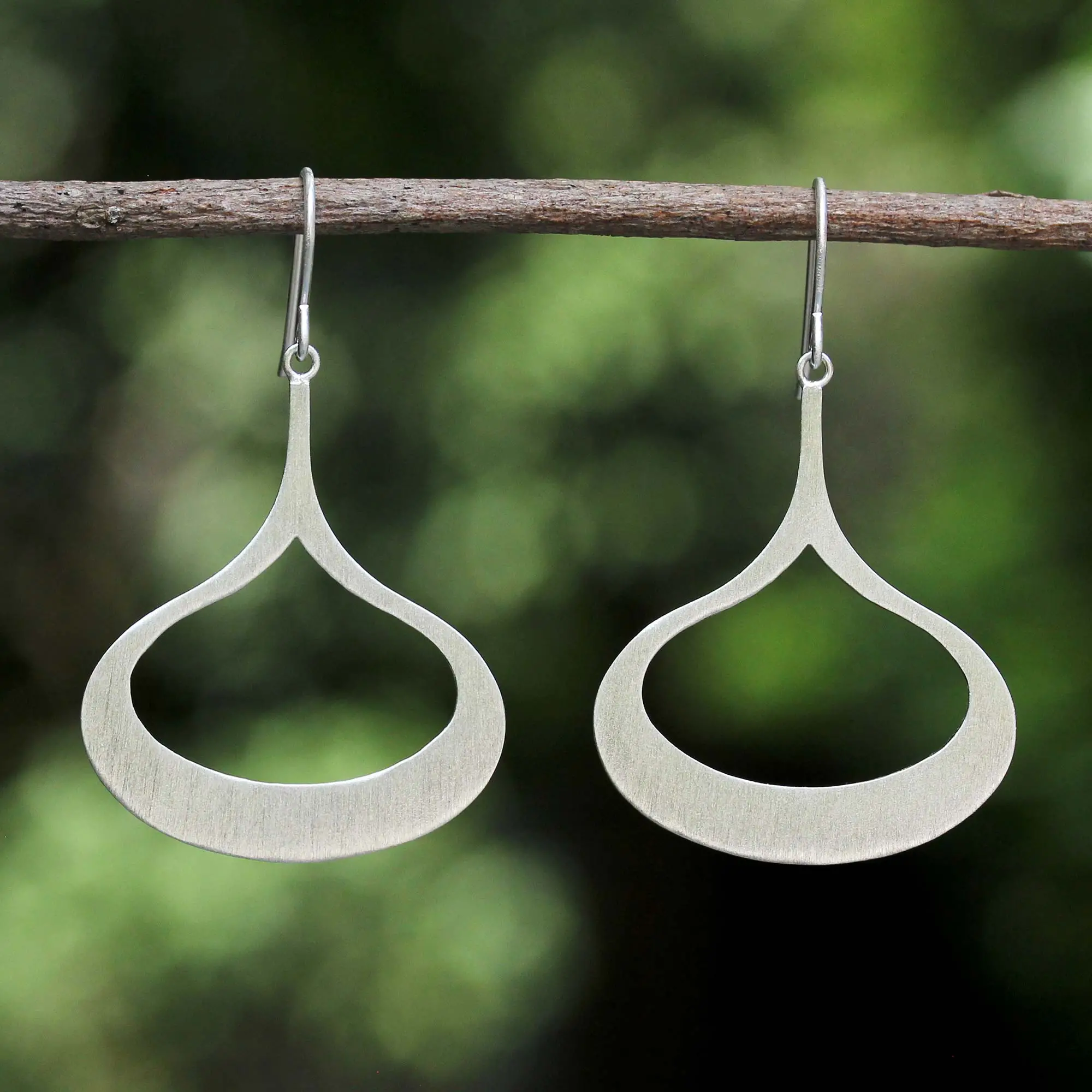 Created by Jantana from Thailand, these unique earrings are handcrafted from brushed sterling silver in a raindrop silhouette which artfully dangle from sterling wires. The contemporary design complements with luminous grace.