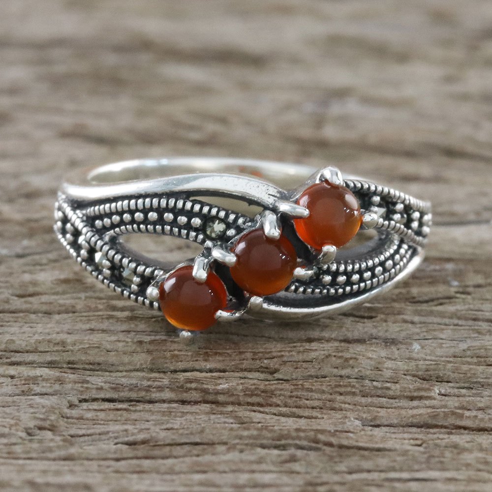 Sterling Silver Orange Onyx Faceted Marcasite 3-Stone Ring, 'Eternal Orange'
