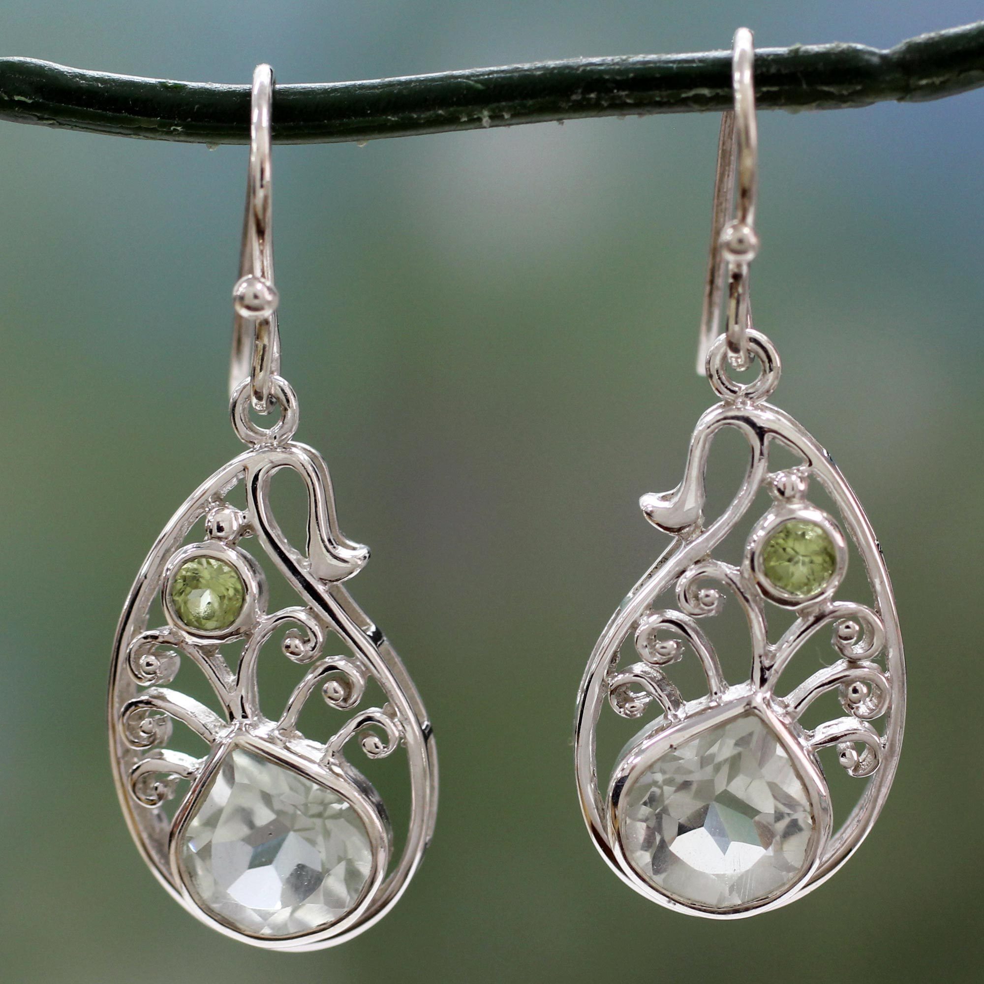 Nestled within sterling silver paisley earrings, prasiolite and peridot glow with everlasting beauty. Shubhra Singh designs modern earrings with the classic boteh (paisley), representing the totality of life in a single drop according to Hindu traditions. Gemstone weight is approximately 3.8 carats.