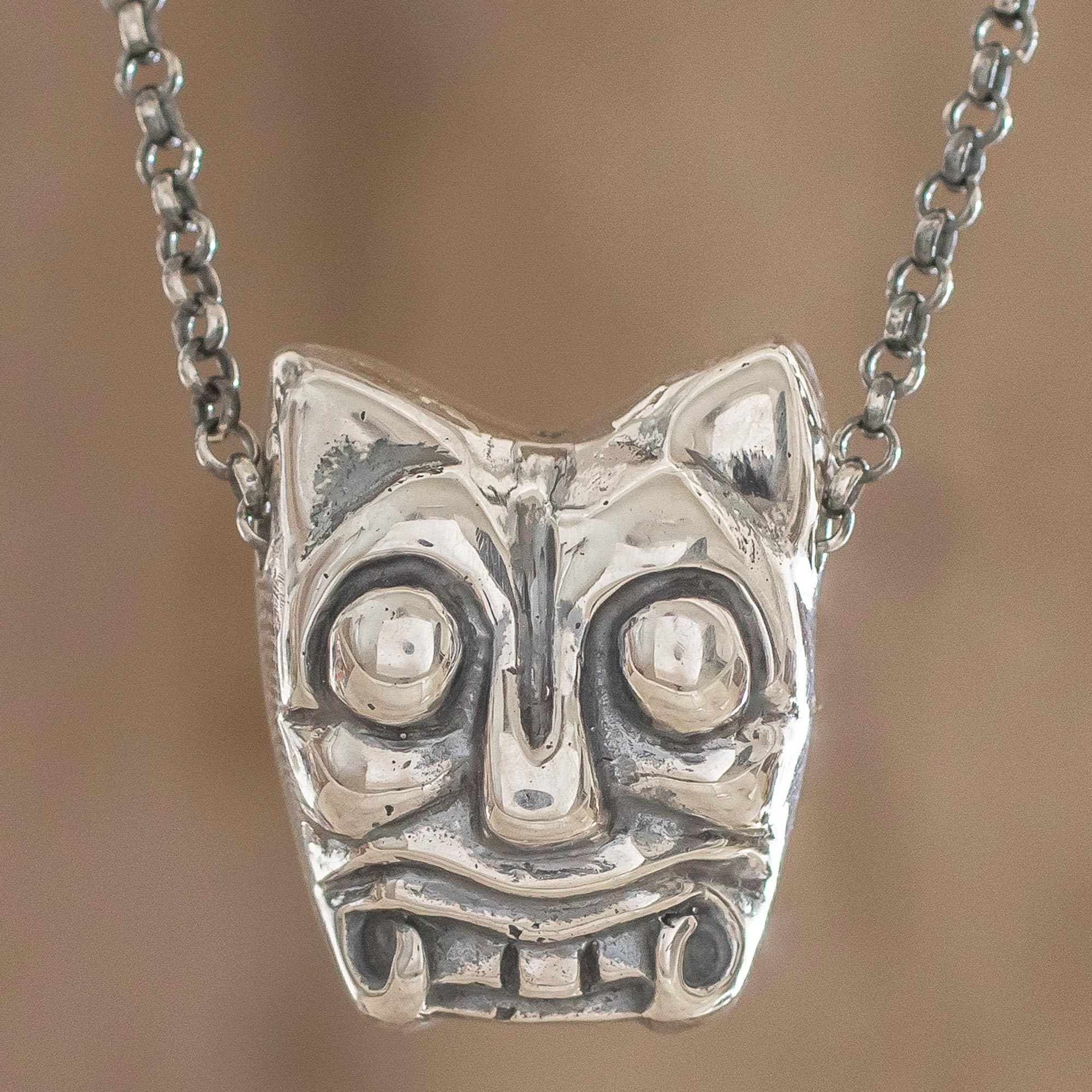 Sterling Silver Pendant Necklace Crafted in Guatemala, 'Iximche Jaguar'