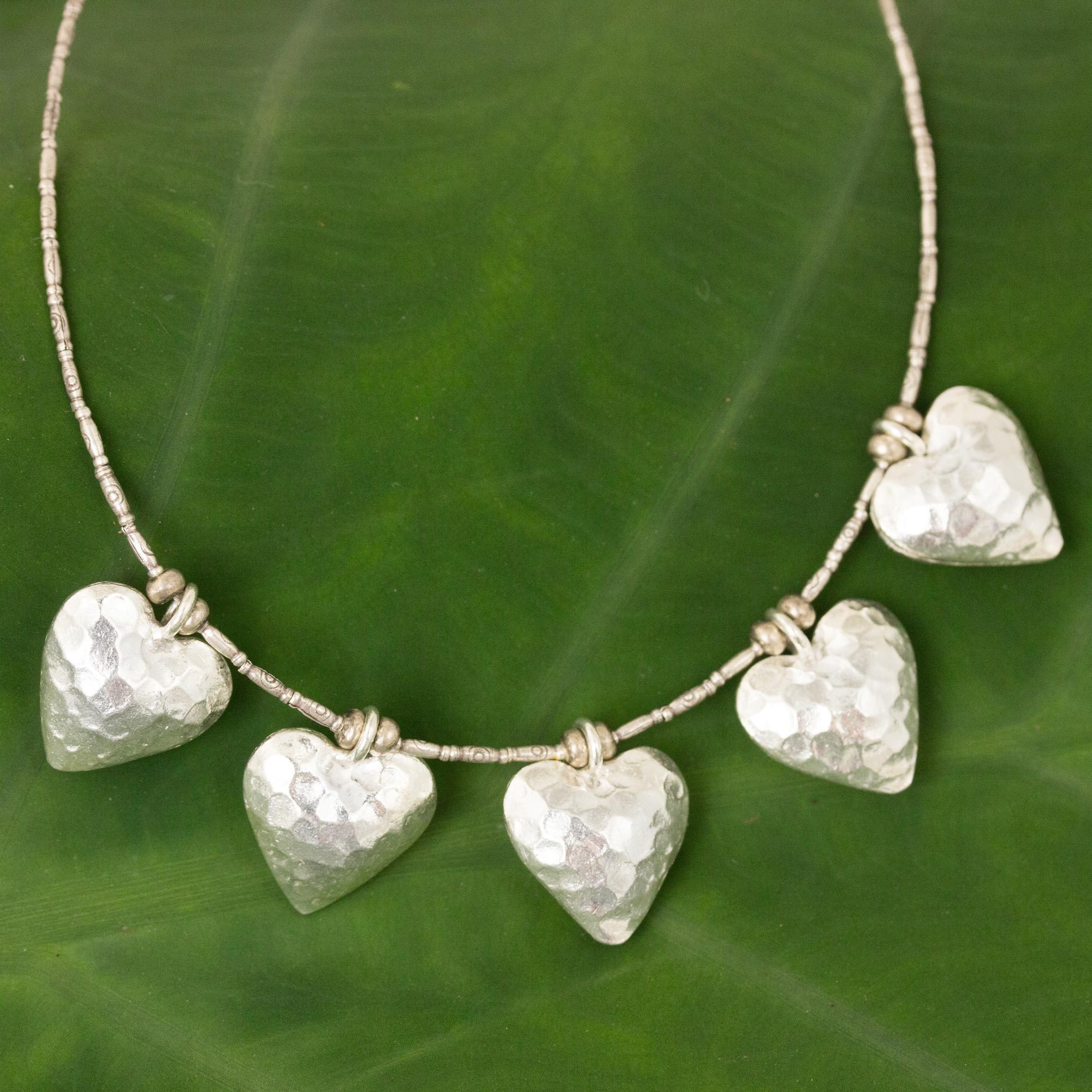 Relax when you wear this light and airy puffy heart necklace from Thailand. Crafted by Sasithon Saisuk, these five puffy hearts take shape from hammered sterling silver on a beautiful chain. This unique piece boasts a subtle look that will go with the latest designs, giving you a versatile addition to your jewelry collection.