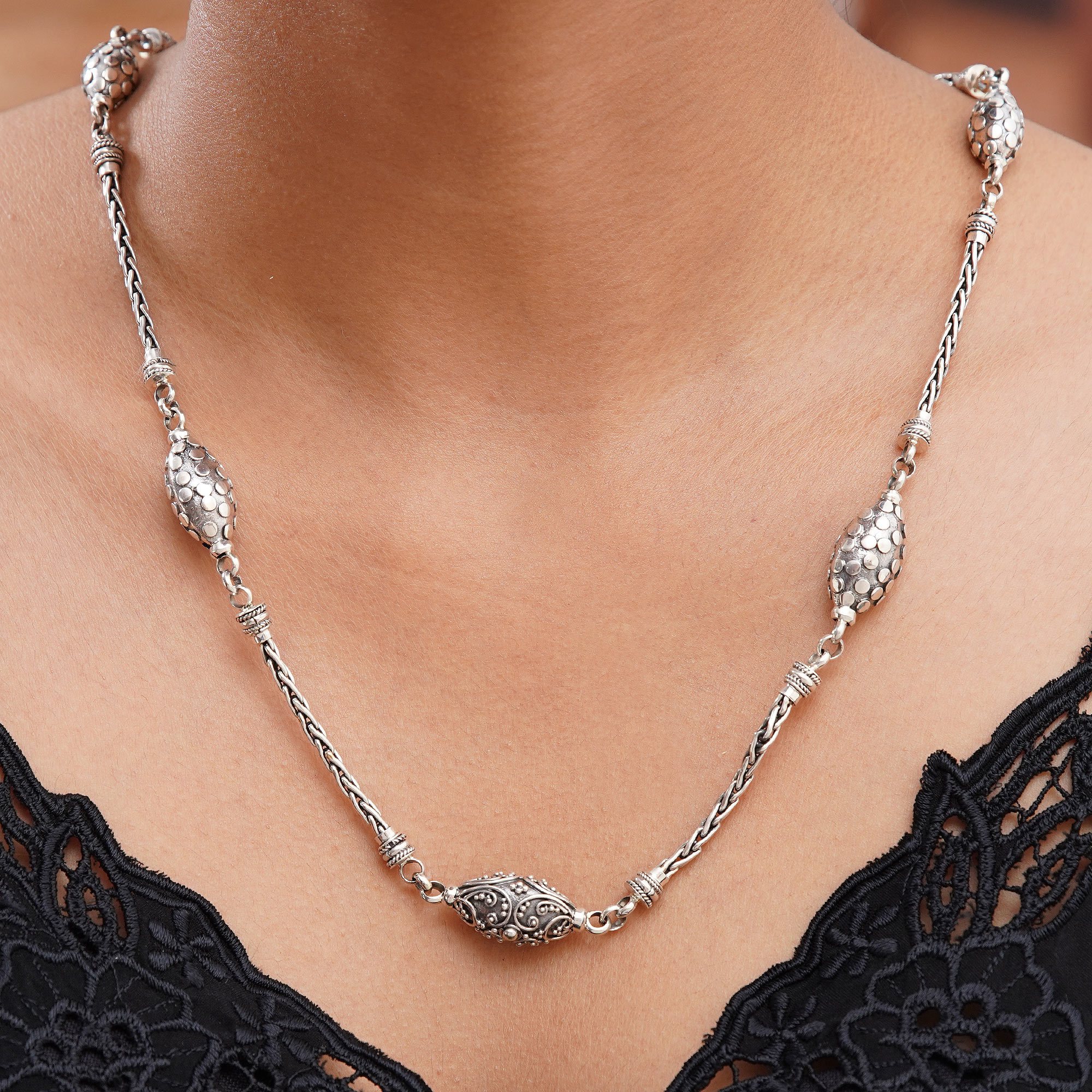 Stylized ladybugs punctuate a finely braided chain. By Wayan Sarjana, this necklace fuses Balinese tradition with contemporary fashion. The ornate design is handcrafted of sterling silver.