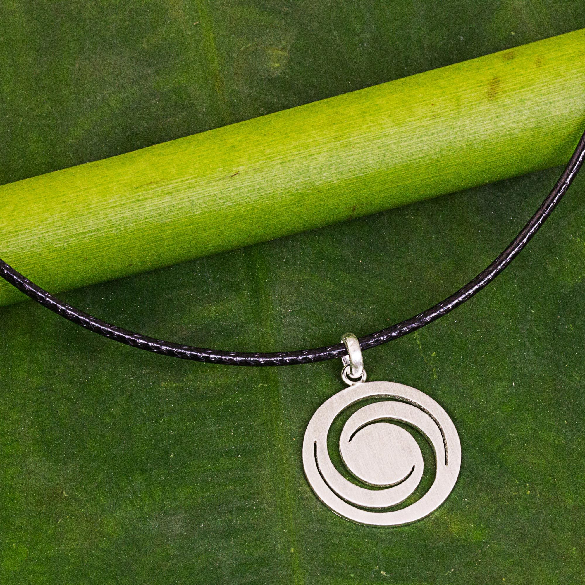 Featuring a brushed satin sterling silver pendant with spiral motifs, this necklace has an adventurous spirit. Thai artisan Sarote Lochotinunt displays the pendant on a braided black cord.