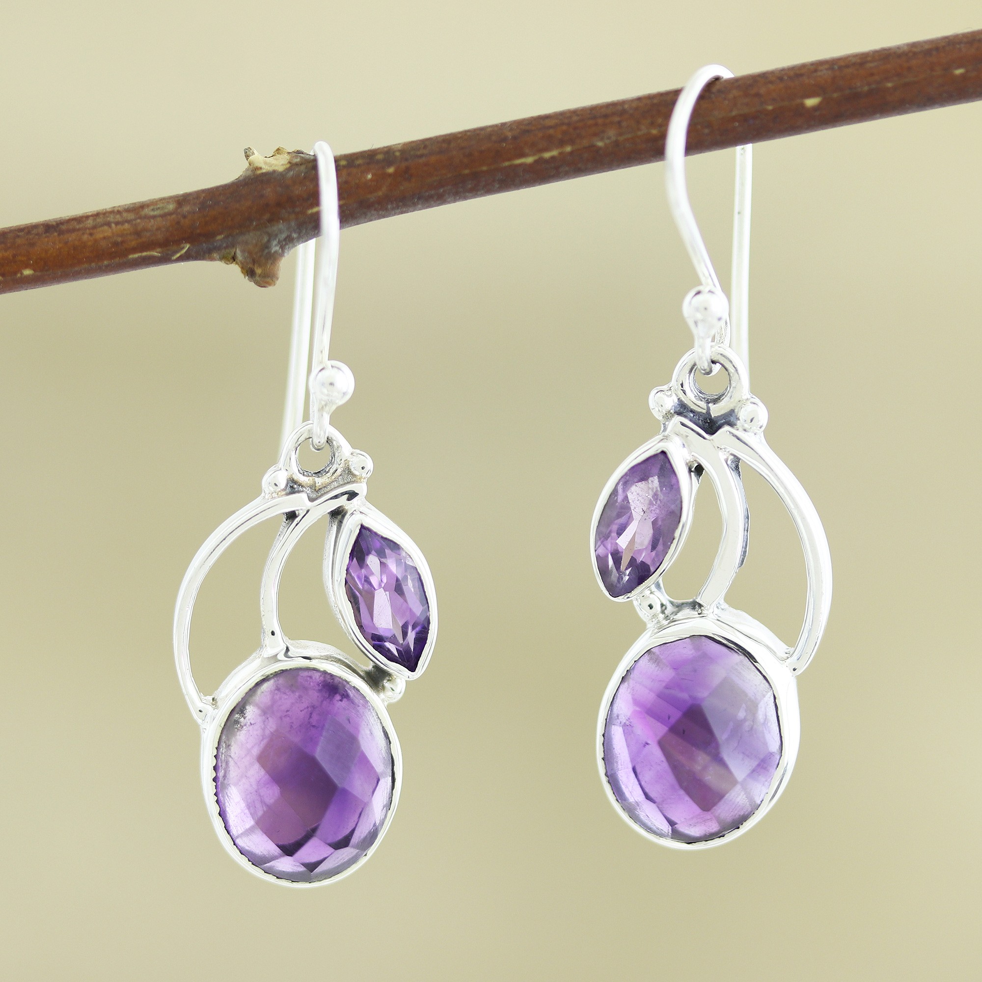 Handcrafted sterling silver motifs created by local artisans surround oval-shaped stones of purple amethyst in bezel settings. India's Shanker presents a beautiful pair of dangle earrings that glow with cool purple hues.