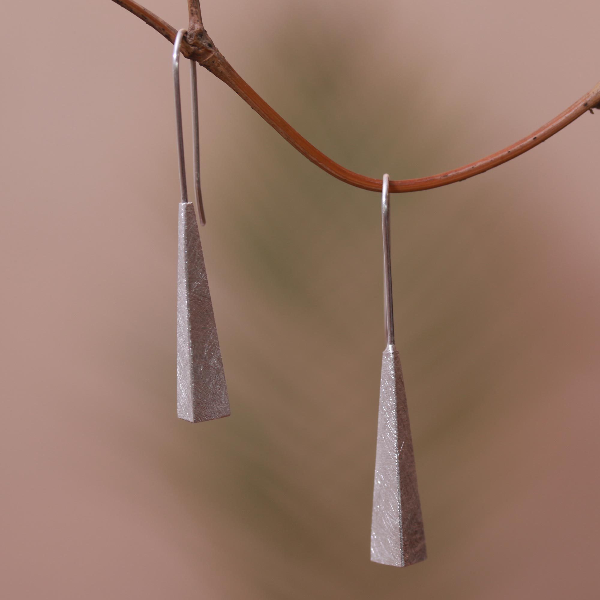 Striking in their beauty, these drop earrings are created by Desi Antari in Bali. Two bold pyramids are crafted from sterling silver, treated with a brushed-satin finish that elegantly captures the light.