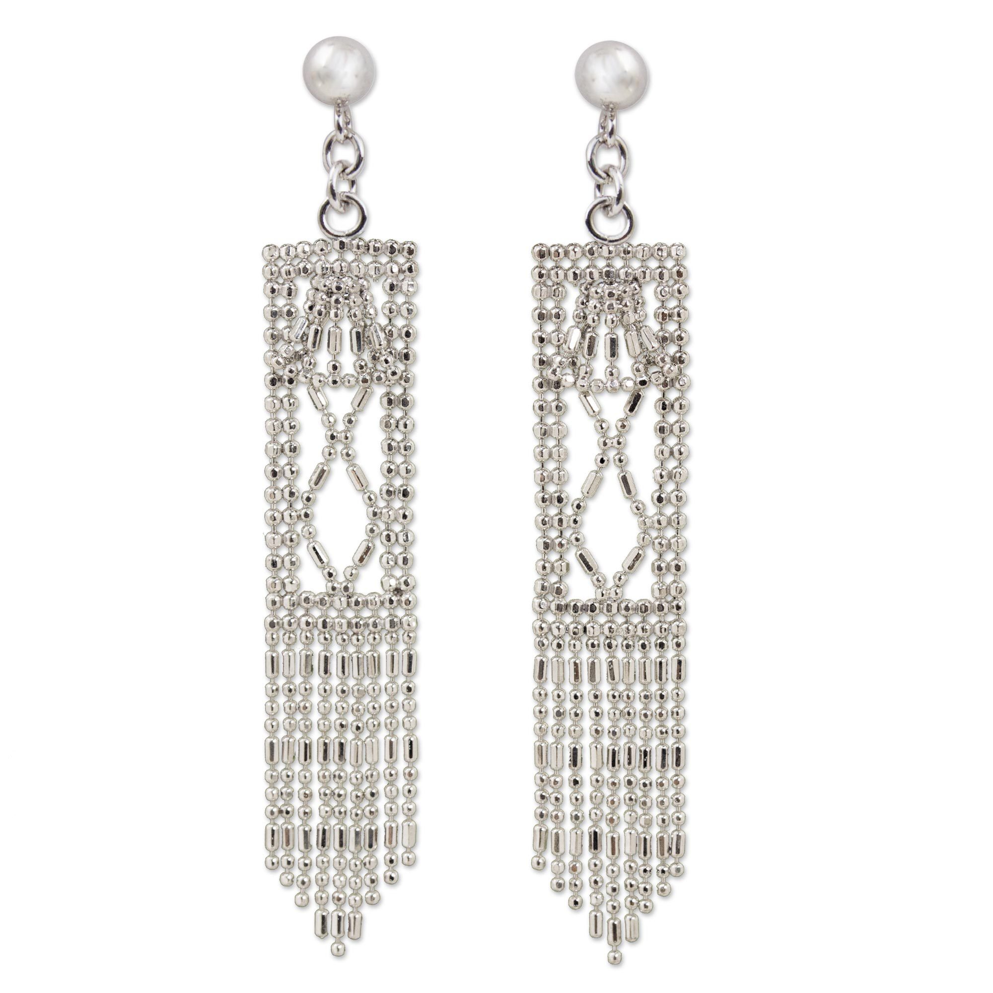 Featuring long rectangles with dangling fans and waterfall chains, these dangle earrings are truly impressive. Thai artisan Angels crafts each pair from sterling silver ball chain that sparkles in the light.