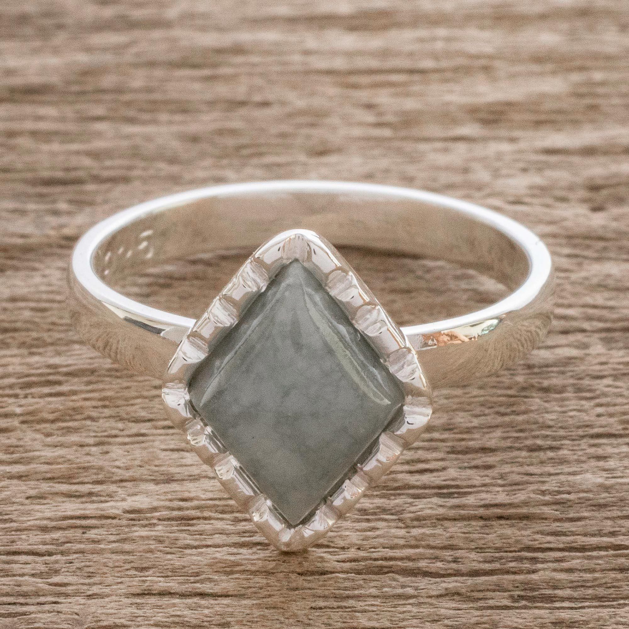 Sterling Silver Ring with an Apple Green Jade Diamond, 'Dark Green Diamond'