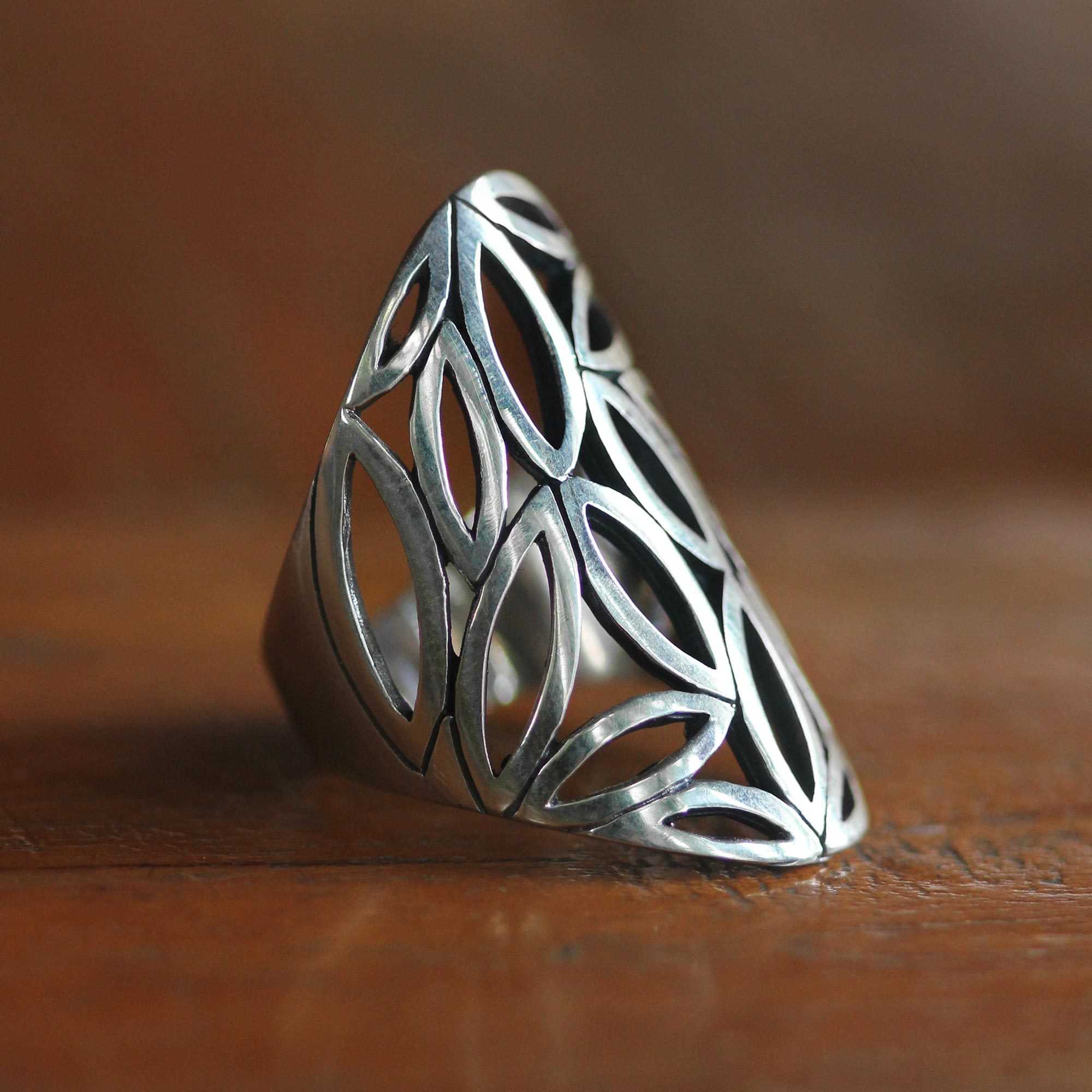 This wonderful cocktail ring in sterling silver is set off by tiny bamboo leaves, and is handcrafted by Sukartini from Bali. The intricate, unique detail of this contemporary piece complements any jewelry collection and creates a fascinating accent.